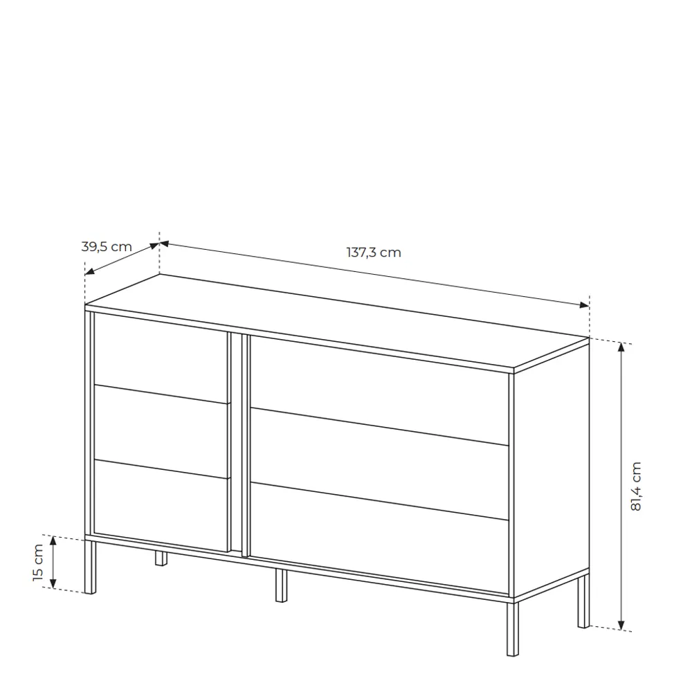 Fünf schwarze Metallfüße und Einfassungen ABS garantieren die Stabilität und Langlebigkeit der Kommode, was bedeutet, dass sie viele Jahre lang halten wird. Diese Kanten sind nicht nur ein ästhetisches Element, sondern schützen auch vor Beschädigungen.
