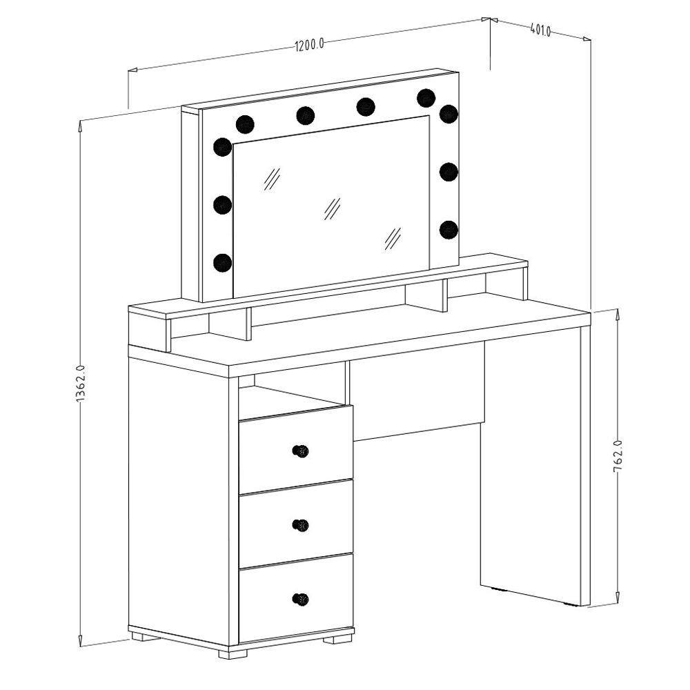 Im Mittelpunkt steht ein Spiegel mit perfekten Proportionen, der nicht nur ein praktisches Element, sondern auch ein dekorativer Blickpunkt ist. LED-Beleuchtung hebt den Spiegel dezent hervor, verleiht dem Arbeitsbereich einen raffinierten Glamour und bietet den perfekten Rahmen für das Make-up zu jeder Tageszeit.