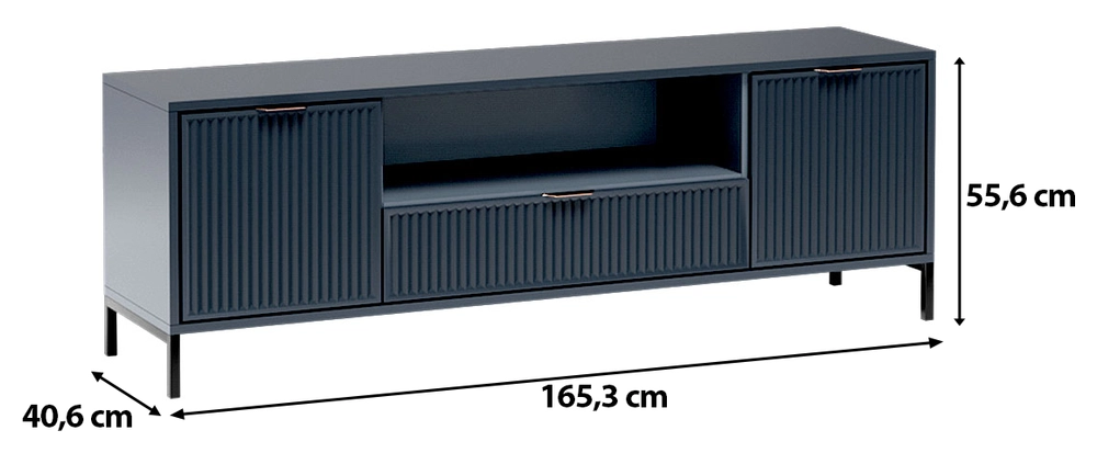 Dieser 165 cm breite RTV-Schrank wurde mit Blick auf eine moderne Ästhetik entworfen und ist die ideale Wahl für alle, die anspruchsvolles Design und Funktionalität schätzen. Seine einzigartige indigoblaue Farbe, kombiniert mit eleganten kupferfarbenen und schwarzen Details, schafft ein beeindruckendes Möbelstück, das der Mittelpunkt jedes Wohnzimmers ist.