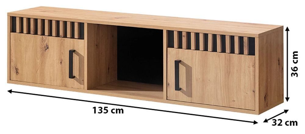 Der Schrank ist mit zwei Türen ausgestattet, die zusätzlichen Stauraum für Gegenstände bieten. In der Mitte des Schranks befindet sich eine offene Nische - der perfekte Ort, um Ihre Lieblingsdekoration, Bücher oder andere Schmuckstücke auszustellen.