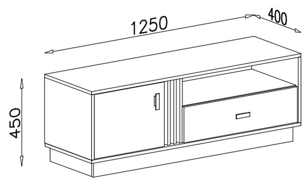 Der Schrank ist 125 cm breit, ideal für kleine und große Wohnräume. Er ist mit einer Tür und einer praktischen Schublade ausgestattet, die zusätzlichen Stauraum bietet. Über der Schublade befindet sich ein offenes Regal - der perfekte Ort, um eine Set-Top-Box, eine Spielkonsole oder andere Multimedia-Geräte unterzubringen.