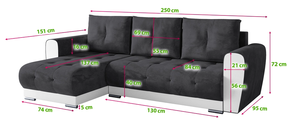 Jedes Detail dieses Sofas wurde für maximalen Komfort und Zweckmäßigkeit entwickelt. Ausklappbares Ecksofa hat einen funktionalen einstreubehälter - diskret versteckt, bietet zusätzlichen Stauraum, der in jeder Wohnung nützlich ist. Tagsüber ist er ein elegantes Sitzmöbel, nachts wird er dank der einfach zu bedienenden Schlaffunktion zu einem bequemen Schlafplatz.