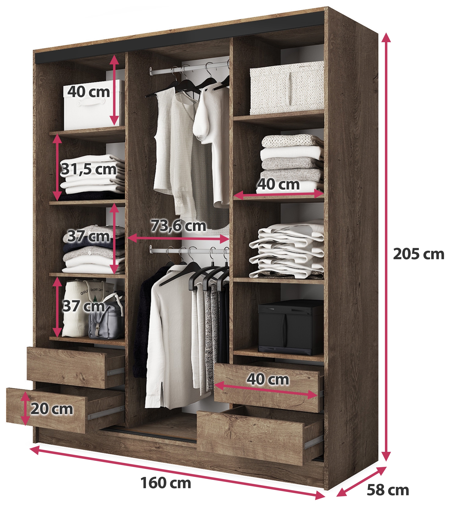 Im Inneren des Kleiderschranks finden Sie acht praktische Regale , die sich ideal zum Ordnen Ihrer Kleidung und Accessoires eignen. Vier geräumige Schubladen bieten zusätzlichen Stauraum für Kleinteile und sorgen dafür, dass alles seinen Platz findet.
