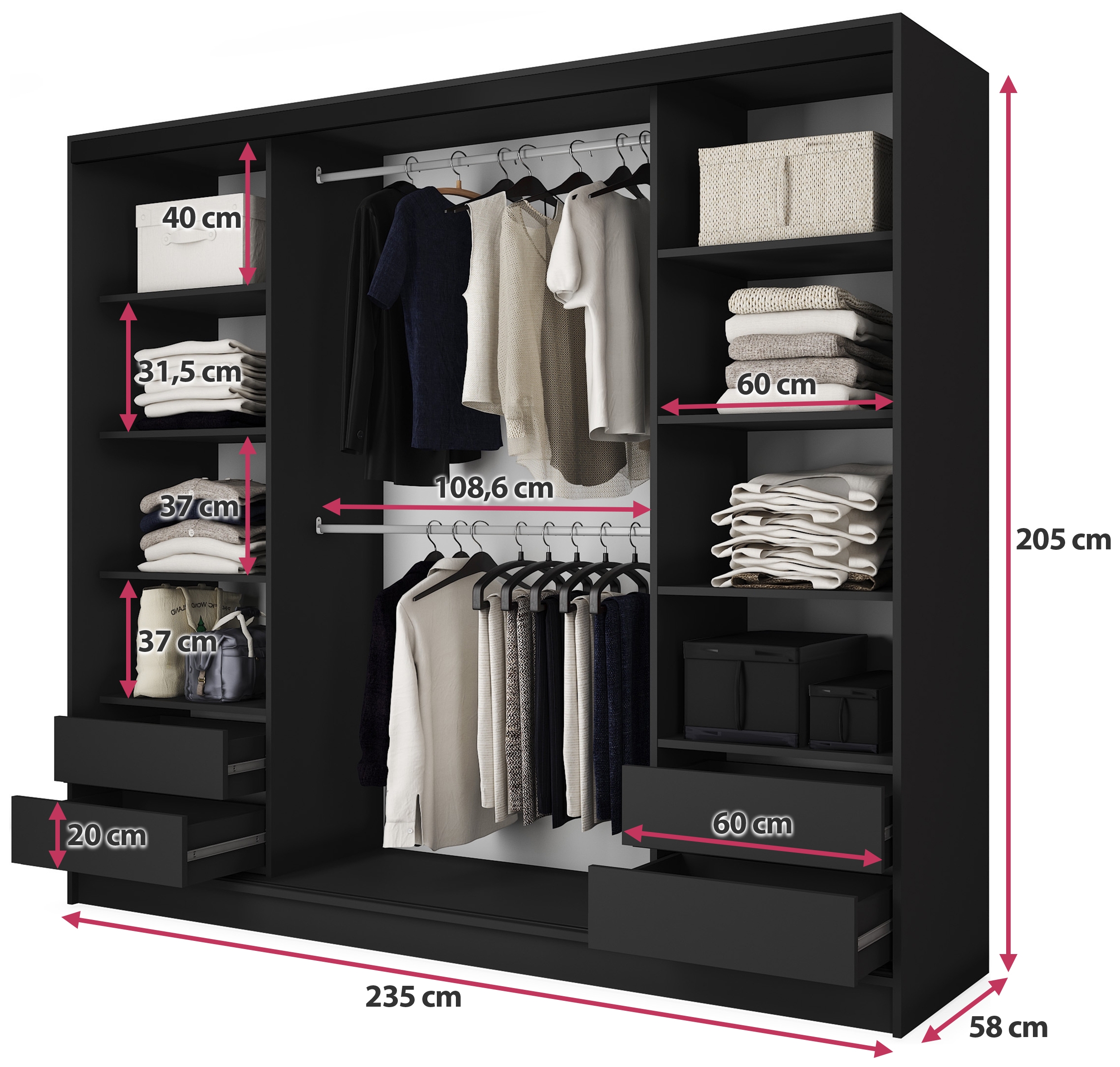 Zusammenfassend ist dieser Schiebetürenschrank eine perfekte Kombination aus Funktionalität, Komfort und modernem Design. Dank ihm wird jeder Raum eleganter und das Aufbewahren von Kleidung und anderen Gegenständen wird einfacher und angenehmer. Mit diesem Kleiderschrank erwerben Sie nicht nur ein schönes Möbelstück, sondern auch eine praktische Lösung für Ihr Zuhause.