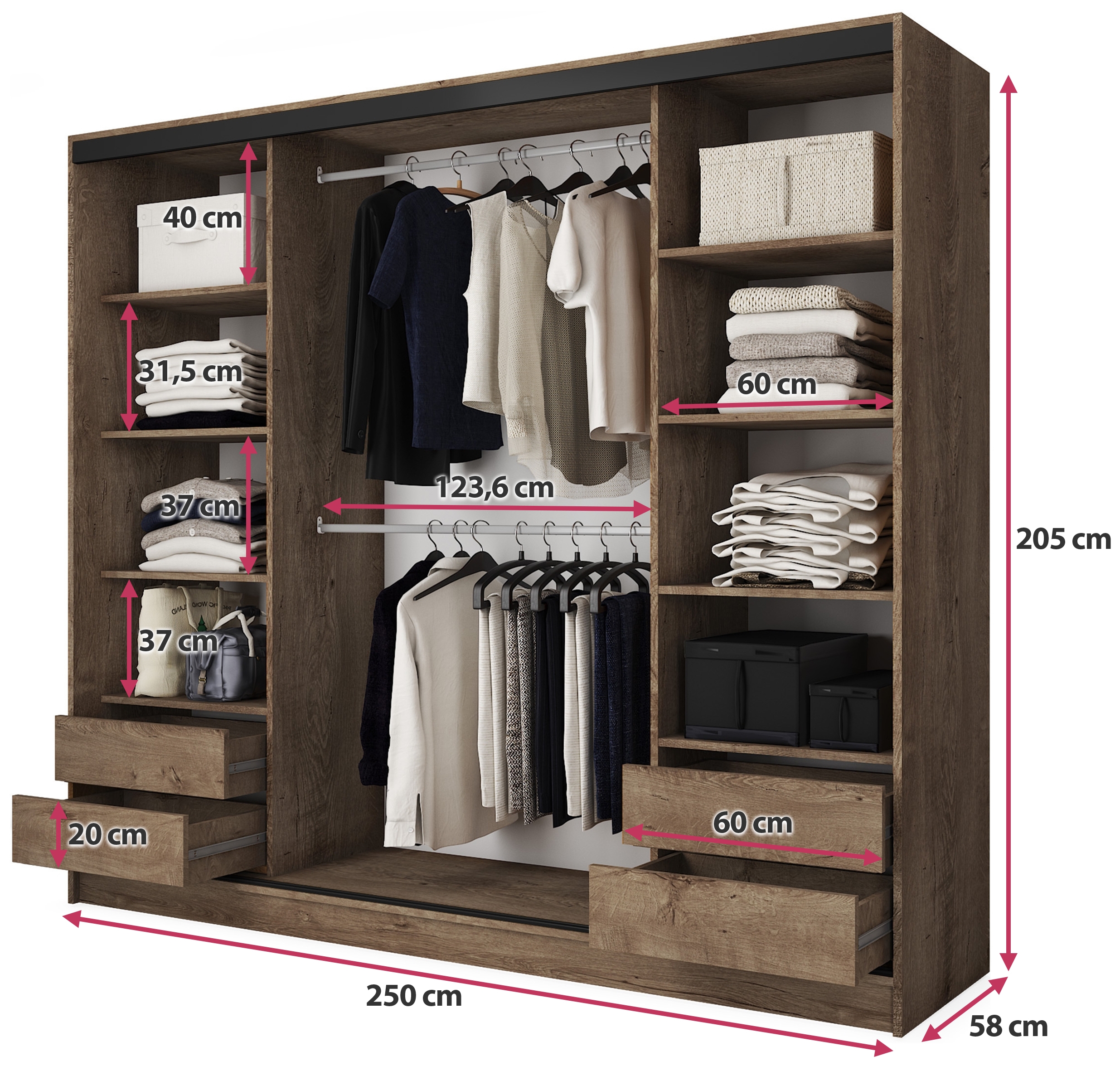 Der Innenraum des Kleiderschranks bietet acht geräumige Regalböden , die viel Platz zum Ordnen von Pullovern, Hemden und anderen Accessoires bieten. Darüber hinaus ermöglichen vier geräumige Schubladen auf Kugellagern einfachen Zugriff und leises Schließen – ideal für Menschen, die Wert auf Diskretion und Komfort legen.