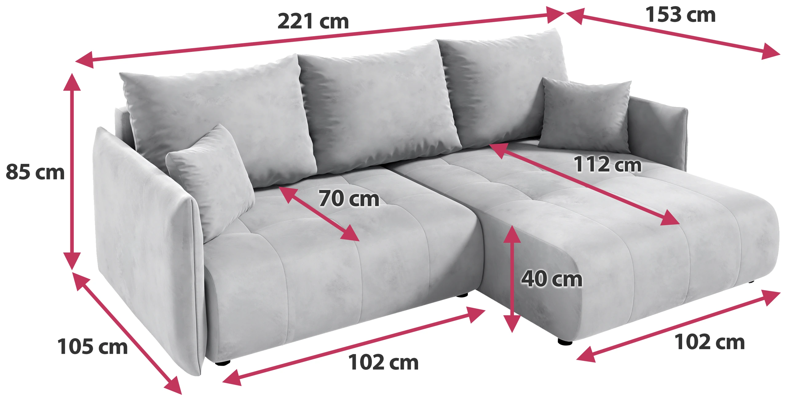 Das Ecksofa kann für eine links- oder rechtsseitige Konfiguration angepasst werden, wodurch es sich perfekt an die Form und Größe des Raums anpassen lässt. Vielseitigkeit und Anpassungsfähigkeit in einem.