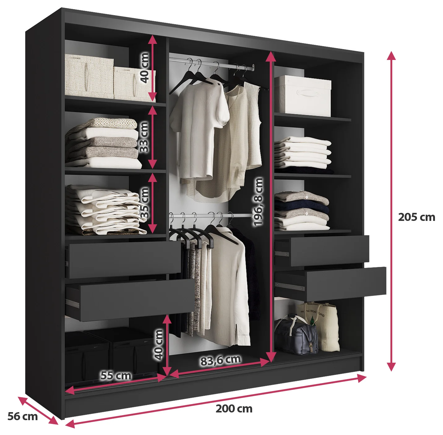 Der Schiebetürenschrank LOFT 200 cm ist die perfekte Lösung für Menschen, die Wert auf modernes Design und funktionale Möbel legen. Seine einzigartigen Fronten mit dekorativen Lamellen verleihen dem Innenraum einen industriellen Charakter und die zentrale Tür mit Spiegel vergrößert den Raum optisch und verleiht dem Innenraum Leichtigkeit.