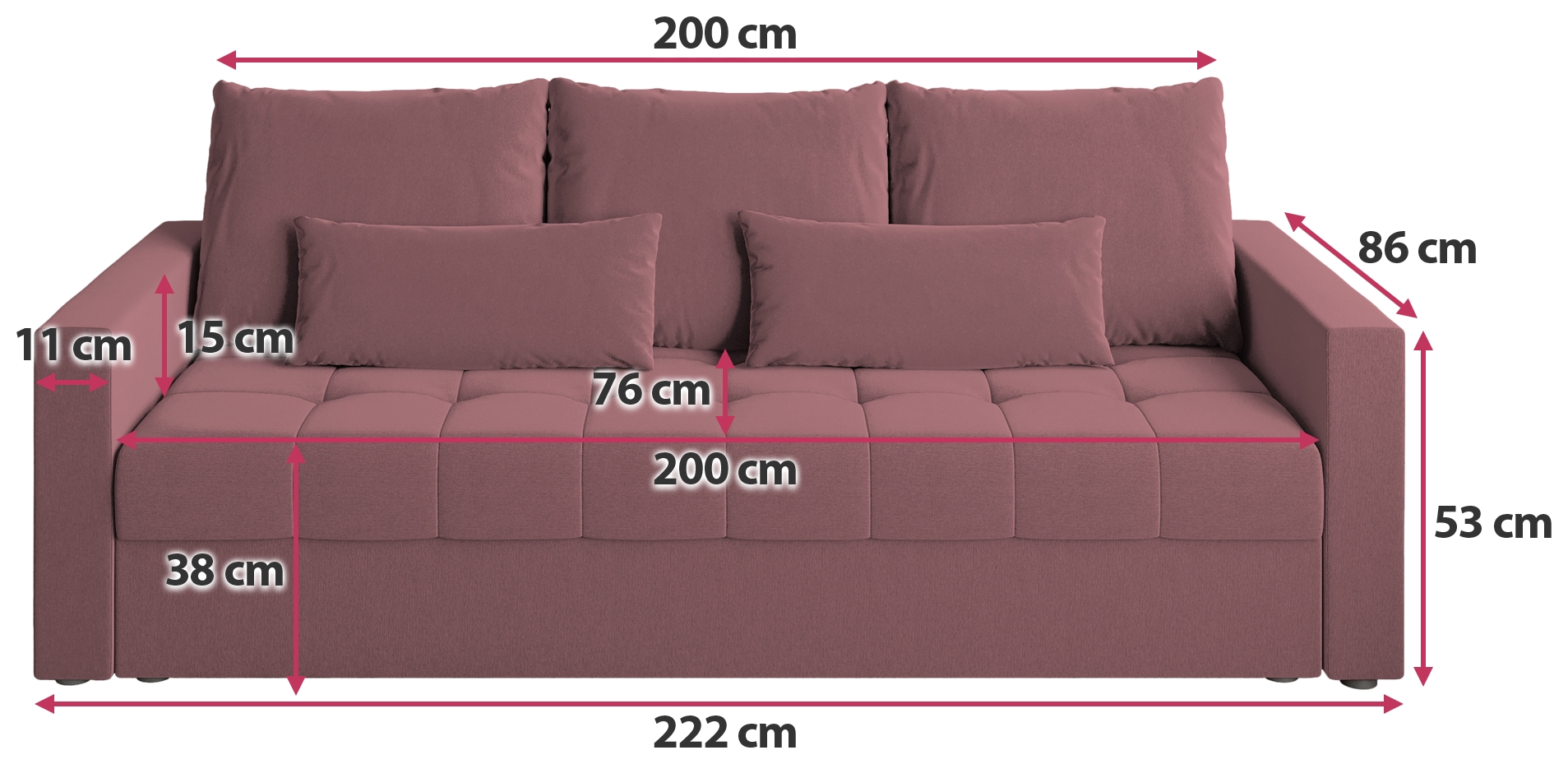 - Das Sofa verfügt über eine Schlaffunktion und hat eine Fläche von 135x200 cm . Die Liegeposition erreichen Sie, indem Sie den Sitz zu sich heranziehen und die Rückenlehne umklappen.