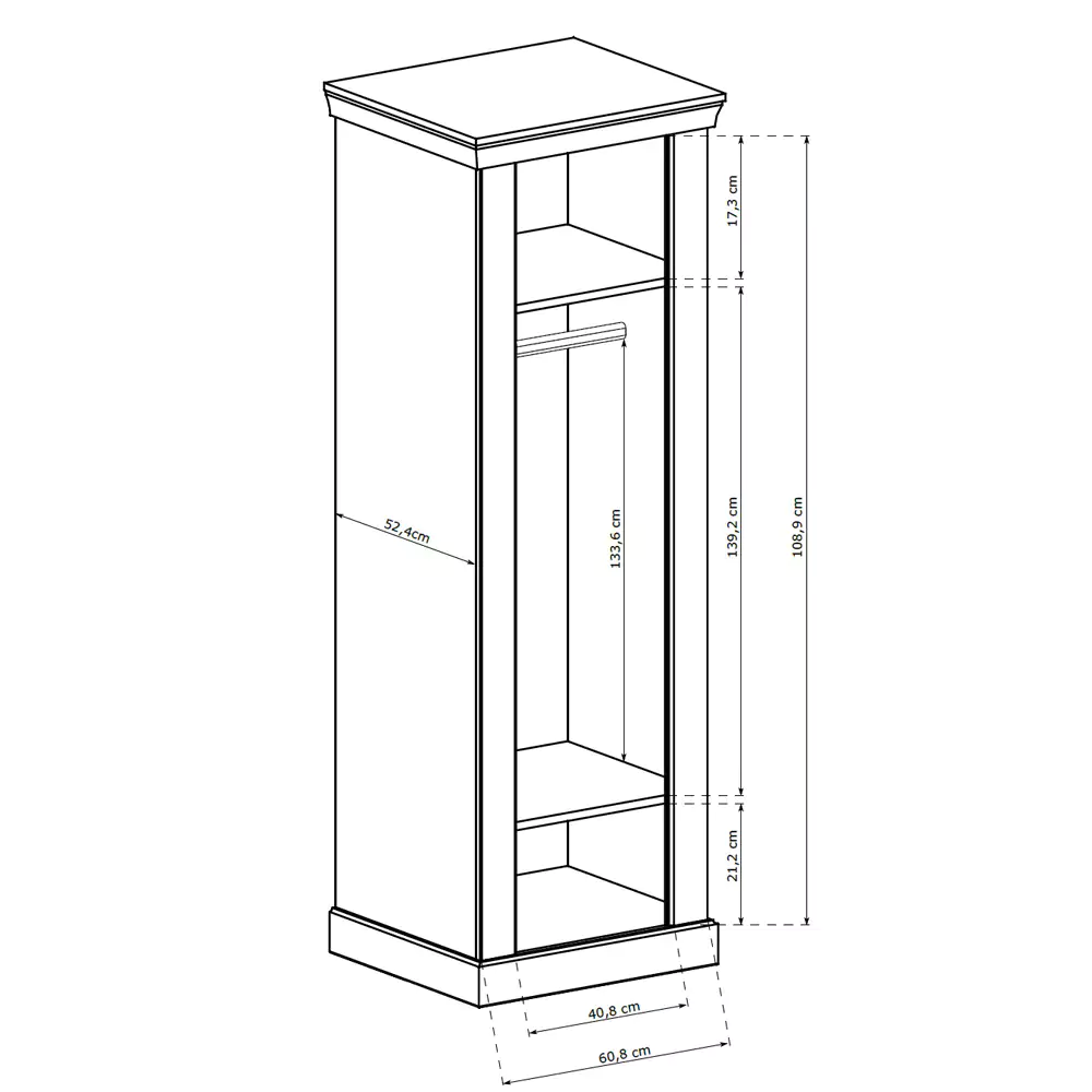 Kabinett ADRE ist ein Vorschlag, der sich dank seines Designs sowohl für klassische Wohnzimmer als auch für Schlafzimmer eignet. Der Kleiderschrank ist mit einer Nische am Boden und einer Kleiderstange ausgestattet, über der sich ein Regal befindet.