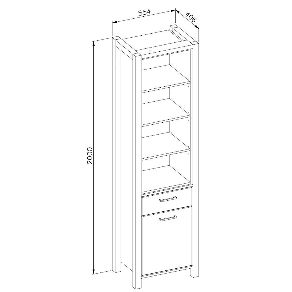 Website ANGELINO ist ein Vorschlag in einem modernen und zeitlosen Stil, der Ihr Wohnzimmer einzigartig machen wird. Das Bücherregal verfügt über vier offene Ebenen, die sich perfekt für die Platzierung von Büchern und verschiedenen kleinen Dekorationen eignen, um dem Raum eigene stilistische Akzente zu verleihen. Außerdem verfügt das Regal über eine kugelgelagerte Schublade unter den offenen Ebenen und eine Tür, hinter der sich zwei Ebenen zur Aufbewahrung von Dingen befinden, die man vor dem Tageslicht verstecken möchte. Das Bücherregal hat Metallgriffe mit matter Oberfläche, die ihm zusätzliche industrielle Akzente verleihen.