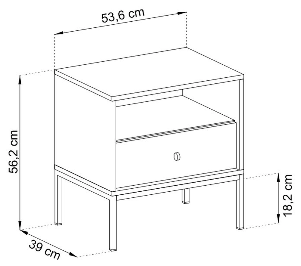Über der Schublade befindet sich ein offenes Regal, das zusätzlichen Platz bietet und Ihnen die Möglichkeit bietet, Ihre Lieblingsbücher, eine Uhr oder eine Nachtlampe zu präsentieren. Es handelt sich um eine praktische und ästhetische Lösung, mit der Sie den Raum individuell gestalten und eine einzigartige Schlafzimmeratmosphäre schaffen können.