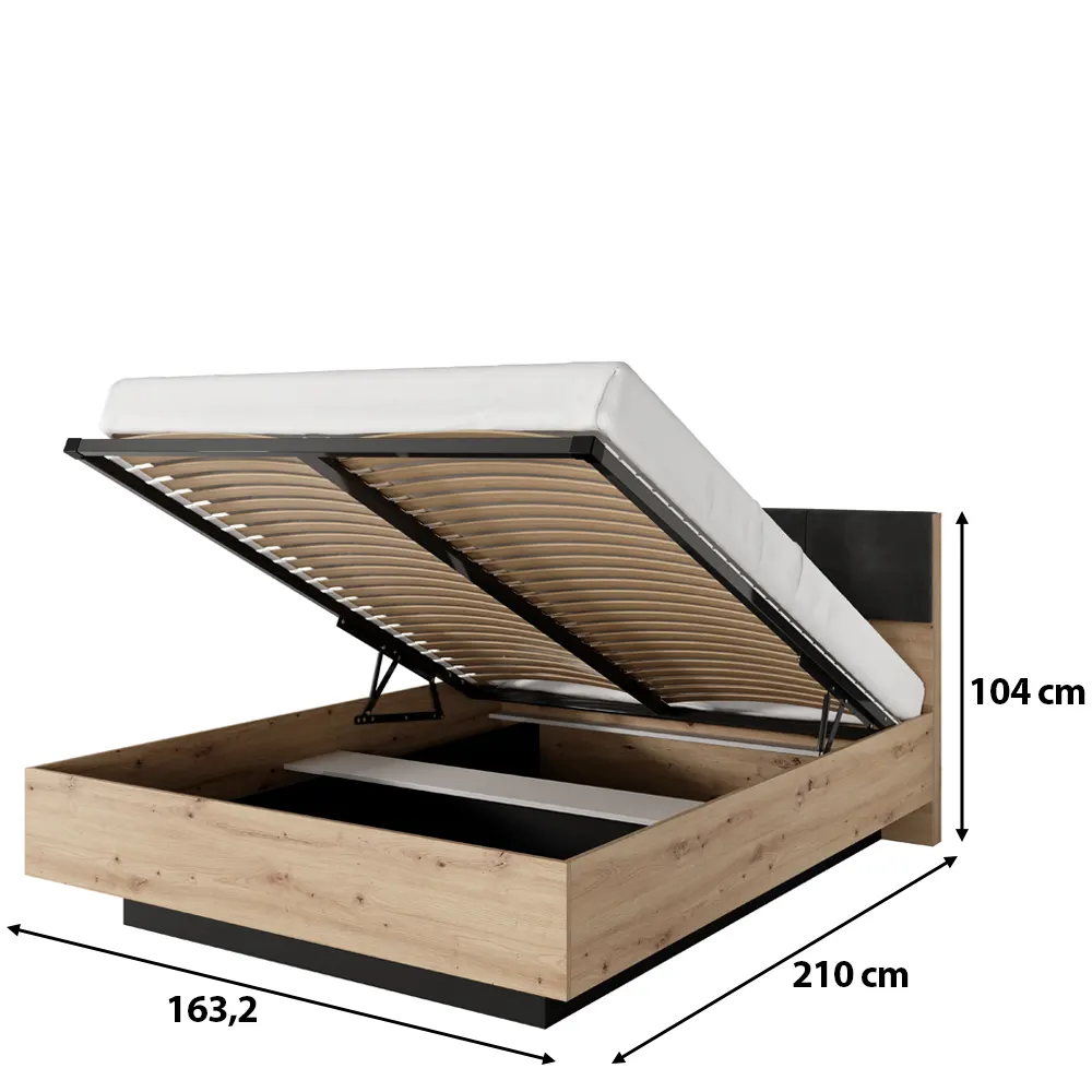 Das moderne Bett ist aus hochwertigen Materialien gefertigt, die Langlebigkeit und Widerstandsfähigkeit im täglichen Gebrauch gewährleisten. Der Korpus aus handgefertigter Eiche ist nicht nur stilvoll, sondern auch äußerst langlebig, während die anthrazitfarbenen Details dem gesamten Design einen modernen Hauch von Finesse verleihen.