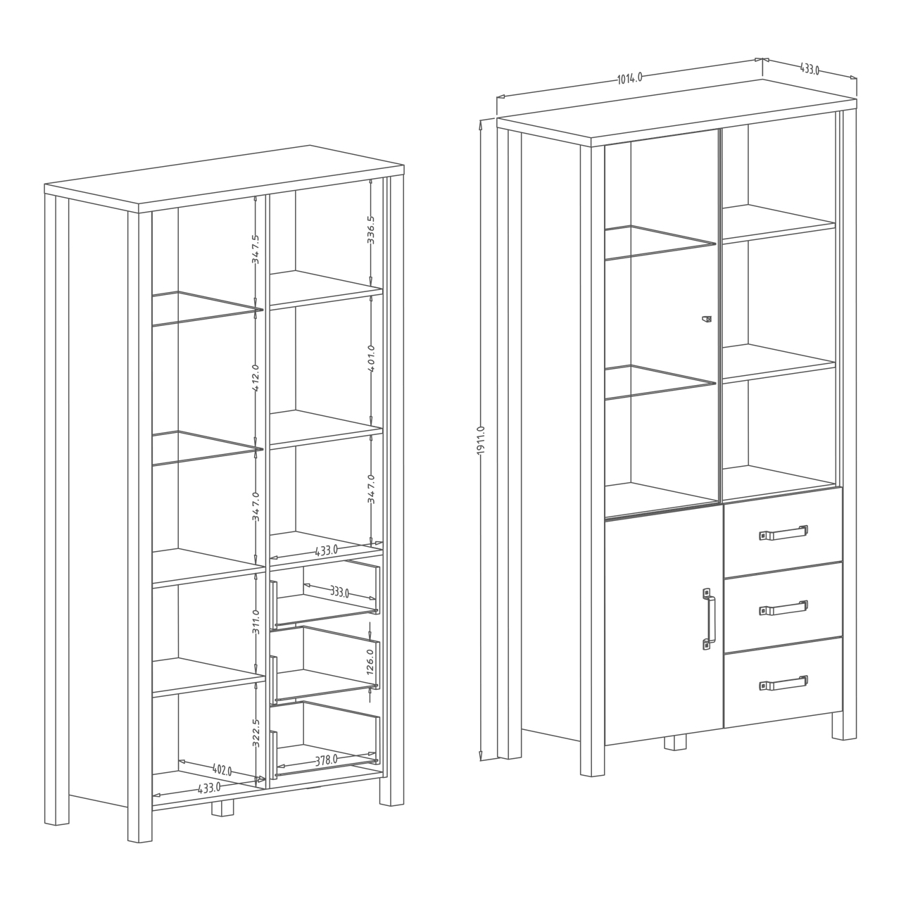 - Die Schubladen der Vitrine sind auf kugelgelagerten Vollauszügen montiert.