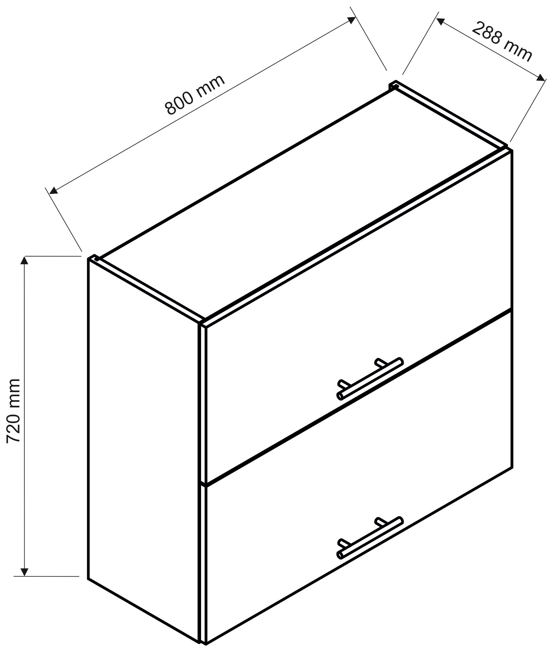 • Der Küchen-Hängeschrank BRIT ist mit einem Türenpaar ausgestattet, hinter dem sich Stauraum befindet, der zur Aufbewahrung von Gewürzen, Tellern und mehr genutzt werden kann. Die Fronten bestehen aus langlebiger MDF-Platte und die Griffe aus Metall.