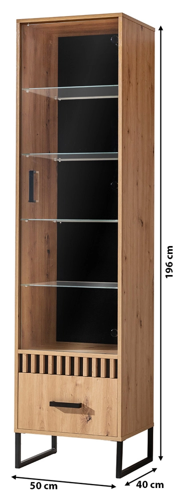 Der Schrank ist mit einer Schublade mit kugelgelagerter Führung ausgestattet, die ein sanftes und leises Öffnen garantiert. Hinter der Glastür befinden sich vier Glasböden, auf denen Sie Ihre Lieblingsbücher, Sammlungen oder wertvollen Erinnerungsstücke ausstellen können.