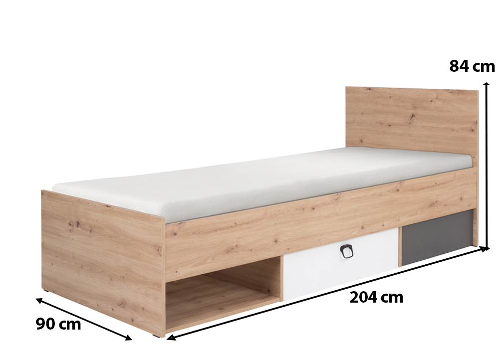 Bett für das Jugendzimmer CAMERUN ist in einem modernen Design gehalten, mit dem es sich perfekt in zeitgemäße Jugendzimmereinrichtungen einfügt. Das Jugendbett ist ausgestattet mit holzmatratzenrahmen mit einer Fläche von 90x200 cm. Außerdem befindet sich unter dem Bettrahmen eine Schublade, die als Bettzeugbehälter dient. Das Bett eignet sich dank seiner soliden Verarbeitung und seines zeitlosen Designs perfekt für moderne Jugendzimmer.