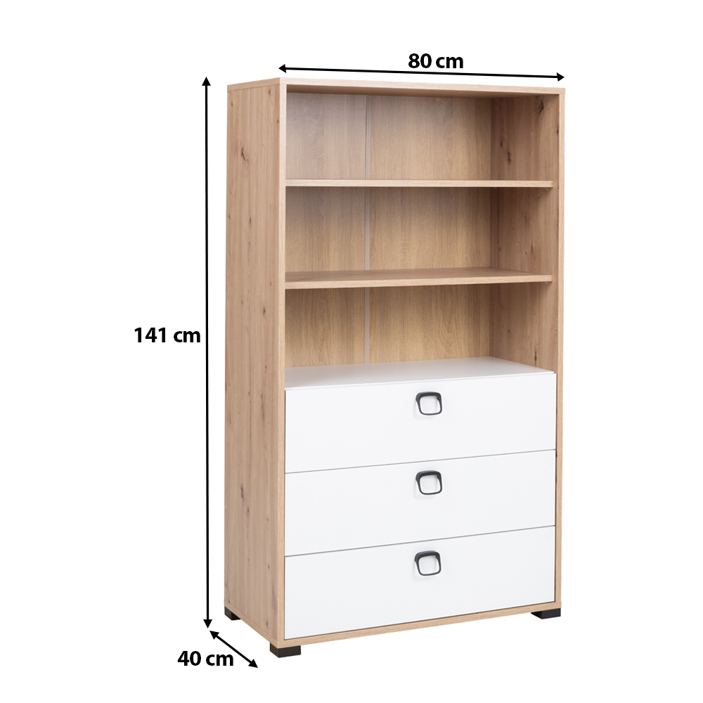 Bücherregal Jugend CAMERUN verbindet modernes Design mit Funktionalität - die perfekte Ergänzung für jedes Jugendzimmer. Das Bücherregal für das Jugendzimmer wurde mit Blick auf die Bedürfnisse der Jugendlichen von heute entworfen und bietet ihnen einen stilvollen und praktischen Platz zum Aufbewahren von Büchern und anderen Gegenständen. Das Bücherregal hat zwei offene Fächer, die viel Platz für die Lieblingsbücher, Alben oder Hefte Ihres Kindes bieten. Dank der offenen Regale hat der junge Leser leichten Zugang zu seiner Literatursammlung und die Möglichkeit, die für ihn wichtigen Gegenstände auszustellen. Im unteren Teil des Bücherregals befinden sich drei geräumige Schubladen auf kugelgelagerten Schienen, zur Aufbewahrung von kleinem Zubehör wie Stiften, Heften und anderen Schulsachen. Die kugelgelagerten Schienen sorgen für ein sanftes und leises Öffnen und Schließen der Schubladen, was jeder Benutzer zu schätzen weiß. Kanten durch ABS-Furnier geschützt, die Verwendung der Regalkonstruktion gewährleistet ihre Langlebigkeit und Widerstandsfähigkeit gegen mechanische Beschädigungen. Darüber hinaus fügt sich dieses moderne Bücherregal dank seines zeitgenössischen Designs perfekt in jede Einrichtung ein und verleiht ihr Frische und Energie.