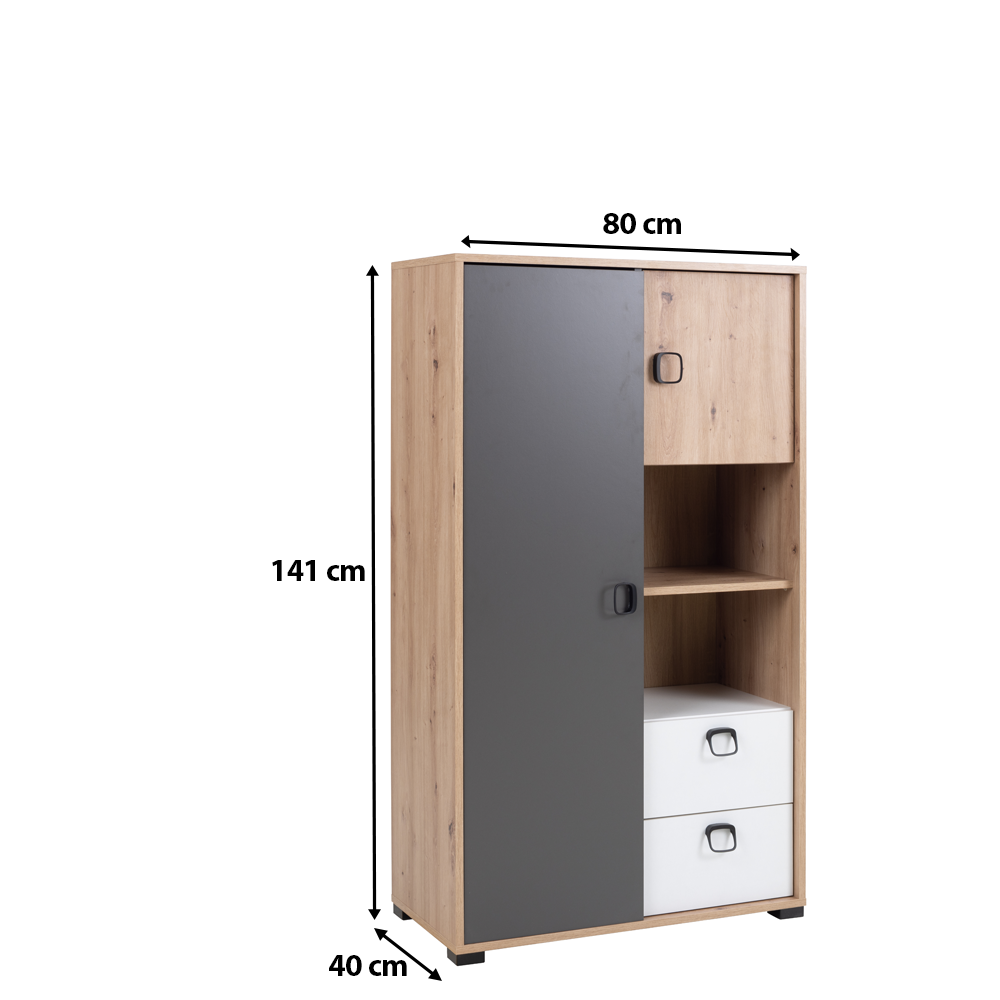Bücherregal Jugend CAMERUN kombiniert modernes Design mit praktischen Lösungen - die perfekte Ergänzung für jedes Jugendzimmer. Das Bücherregal für das Jugendzimmer wurde mit Blick auf die Bedürfnisse der Jugendlichen von heute entworfen und bietet ihnen einen stilvollen und funktionalen Platz zum Aufbewahren von Büchern und anderen Gegenständen. Der Bücherschrank hat zwei offene Ebenen, die viel Platz für die Lieblingsbücher, Alben oder Hefte Ihres Kindes bieten. Dank der offenen Regale hat der junge Leser leichten Zugang zu seiner Literatursammlung und die Möglichkeit, die für ihn wichtigen Gegenstände auszustellen. Im unteren Teil des Bücherregals befinden sich zwei Schubladen auf kugelgelagerten Schienen, zur Aufbewahrung von kleinem Zubehör wie Stiften, Heften und anderen Schulsachen. Die kugelgelagerten Schienen sorgen für ein sanftes und leises Öffnen und Schließen der Schubladen, was jeder Benutzer zu schätzen weiß. Auf der linken Seite des Bücherregals befindet sich eine Tür, hinter der sich zusätzlicher Stauraum für seltener genutzte Gegenstände, Brettspiele oder Aktenkisten befindet. Mit einer Tür werden diese Elemente vor den Blicken der Gäste verborgen und der Raum bleibt aufgeräumt und ästhetisch ansprechend. Kantenschutz mit ABS, die Verwendung der Regalkonstruktion gewährleistet ihre Langlebigkeit und Widerstandsfähigkeit gegen mechanische Beschädigungen. Außerdem fügt sich dieses Bücherregal dank seines modernen Designs perfekt in jede Einrichtung ein und verleiht ihr Frische und Energie.