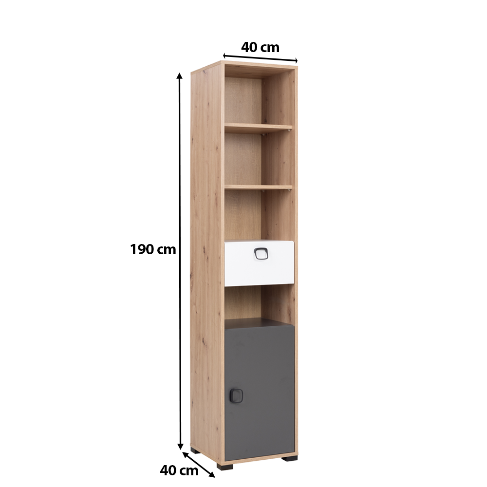 Bücherregal Jugend CAMERUN kombiniert Funktionalität, Stil und Komfort - ideal für das Jugendzimmer. Dieses 40 cm breite Jugendbuchregal wurde mit Blick auf die Bedürfnisse der heutigen Jugend entworfen und bietet ihnen eine praktische und ästhetisch ansprechende Aufbewahrungslösung für Bücher und andere Gegenstände. Vier offene Ebenen ein Bücherregal bietet viel Platz für die Lieblingsbücher, Alben oder Hefte Ihres Kindes. Dank der offenen Regale hat der junge Leser leichten Zugang zu seiner Literatursammlung und kann die Gegenstände, die ihm wichtig sind, ausstellen. Im mittleren Teil des Bücherregals befindet sich eine schublade eingefügt auf kugelgelagerten Schienen, die es Ihnen ermöglichen, kleine Accessoires wie Stifte, Notizbücher oder Elektronik aufzubewahren. Kugelgelagerte Schienen sorgen für ein sanftes und leises Öffnen und Schließen der Schublade, was jeder Benutzer zu schätzen weiß. Außerdem verbirgt sich hinter der Tür am unteren Ende des Bücherregals ein praktisches Regal, in dem seltener benötigte Gegenstände, Brettspiele oder Kisten mit Dokumenten aufbewahrt werden können. Mit einer Tür werden diese Elemente vor den Blicken der Gäste verborgen und der Raum bleibt aufgeräumt und ästhetisch ansprechend. Kanten durch ABS-Furnier geschützt, die Verwendung eines Bücherregals in seiner Konstruktion gewährleistet seine Langlebigkeit und Widerstandsfähigkeit gegen mechanische Beschädigungen, und das moderne Design bedeutet, dass dieses Bücherregal für das Jugendzimmer in der Einrichtung gut aussehen wird und ihr Frische und Energie verleiht.