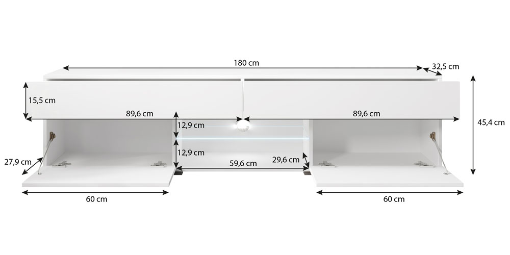 Moderner weißer rtv-Schrank aus der Kollektion CORAL hat fronty in gloss, damit Sie Ihrer Einrichtung einen Hauch von Schick und Eleganz verleihen können, ganz gleich, ob Sie das wollen oder nicht? Ein eleganter und moderner TV-Schrank für Ihr Wohnzimmer? Der TV-Schrank CORAL ist 180 cm breit und hat zwei geräumige Schubladen und drei Aussparungen, von denen zwei davon sind abschließbar, die Ihnen zusätzlichen Platz für die kleinen Dinge bietet, die Sie nicht zur Schau stellen wollen, wenn Ihre Freunde zu Besuch kommen.