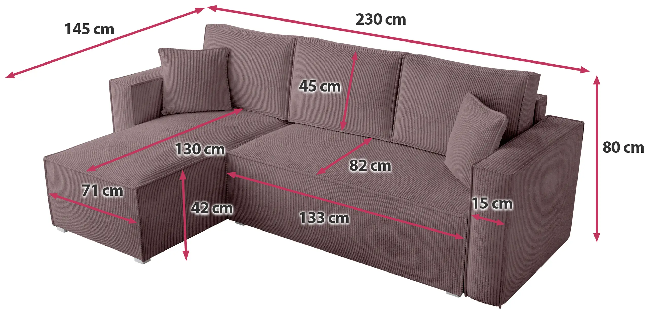 - Die in einer ausgewählten Farbvariante gepolsterte Rückseite des Cord-Ecksofas ermöglicht es Ihnen, das Möbelstück auch mitten im Wohnzimmer zu platzieren.