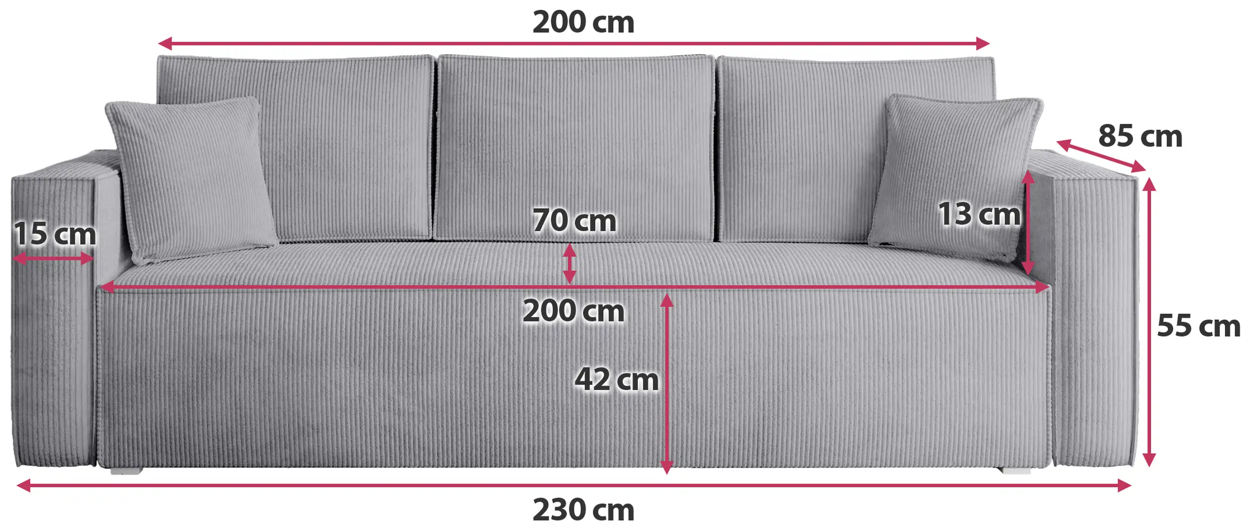 Das Schlafsofa aus Cord wurde mit Blick auf die Zweckmäßigkeit entworfen. Unter der Sitzfläche befindet sich ein Bettwarencontainer , welcher die Möglichkeit bietet, Bettzeug, Decken oder Kissen zu verstauen, ohne zusätzlichen Platz im Kleiderschrank zu beanspruchen.