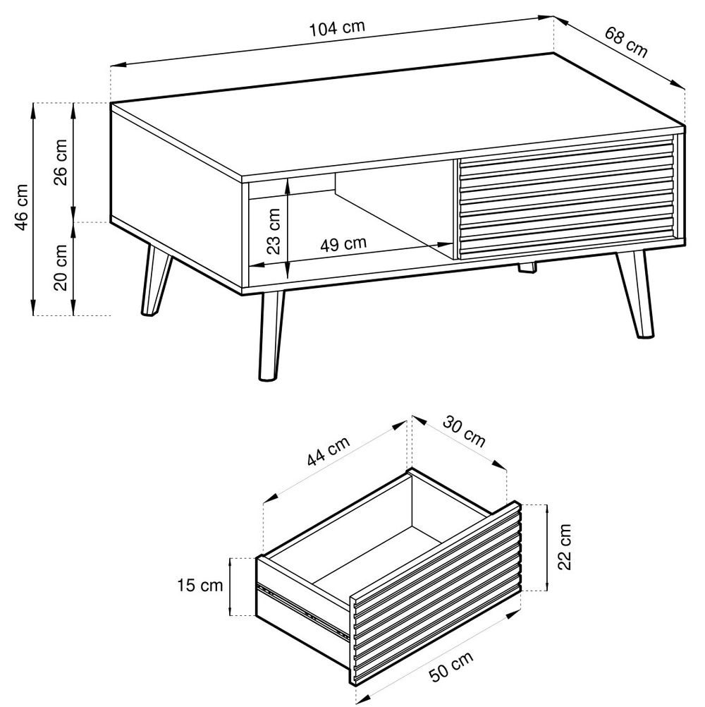 VITERBO Couchtisch im modernen Stil mit einer geriffelten Schublade in der Farbe Artistic Oak. Der Korpus des Wohnzimmertisches ist aus Schichtstoffplatte gefertigt und mit einer ABS-Kante versehen. Die Schublade lässt sich bequem durch das Push-to-Open -System öffnen . Es hat 20 cm hohe schwarze Holzbeine.