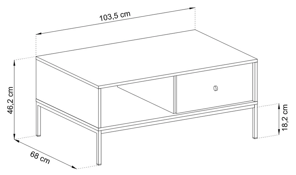 Der Couchtisch verfügt über eine praktische Schublade auf der rechten Seite, welche Ihnen die Aufbewahrung diverser Kleinigkeiten ermöglicht und so für Ordnung in Ihrem Wohnzimmer sorgt. Auf der linken Seite befindet sich ein offenes Regal, das zusätzlichen Platz zum Aufbewahren oder Präsentieren von Dekorationsartikeln bietet.