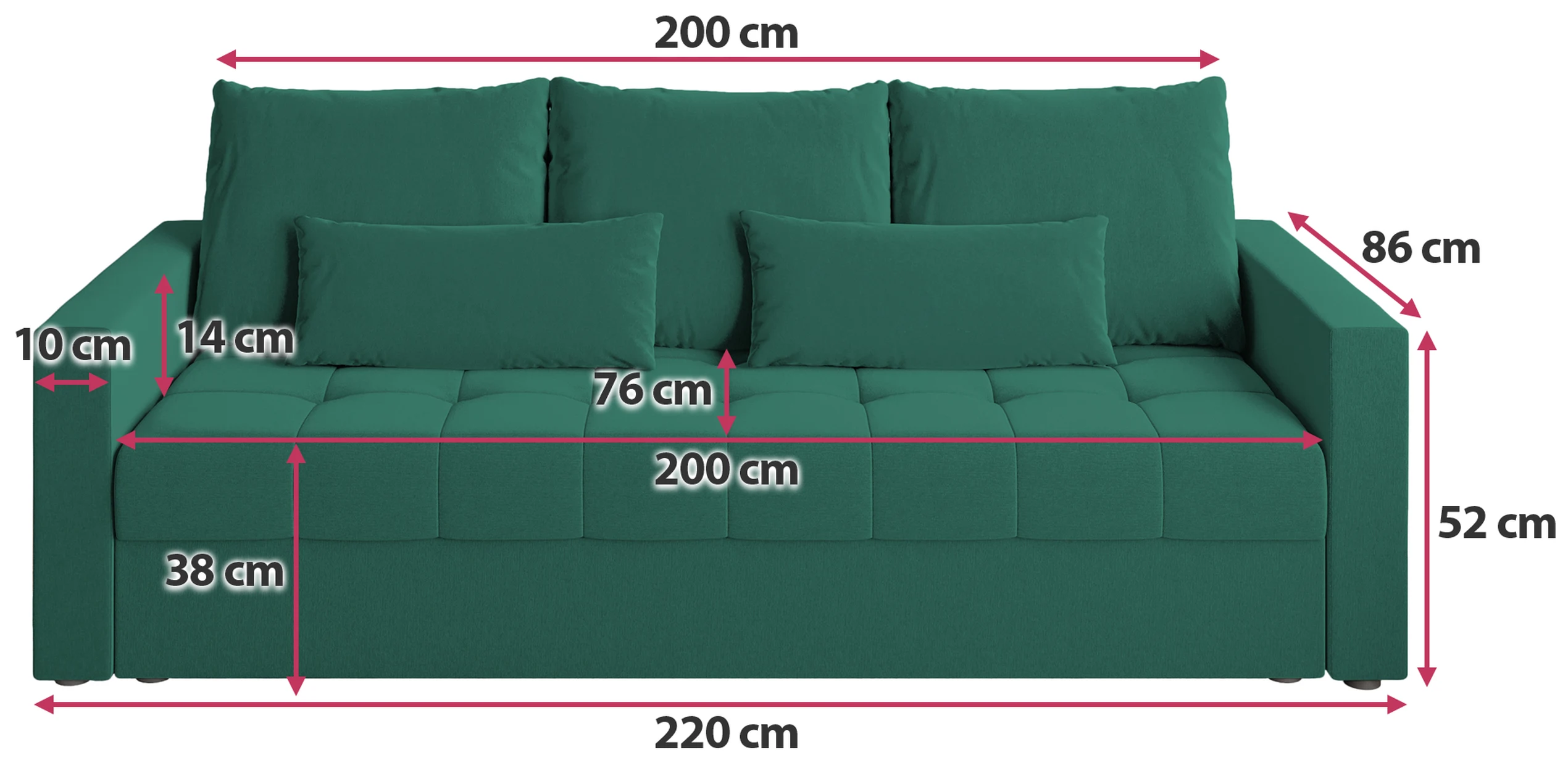 - Das Sofa verfügt über eine Schlaffunktion und hat eine Fläche von 135x200 cm . Die Liegeposition erreichen Sie, indem Sie den Sitz zu sich heranziehen und die Rückenlehne umklappen.