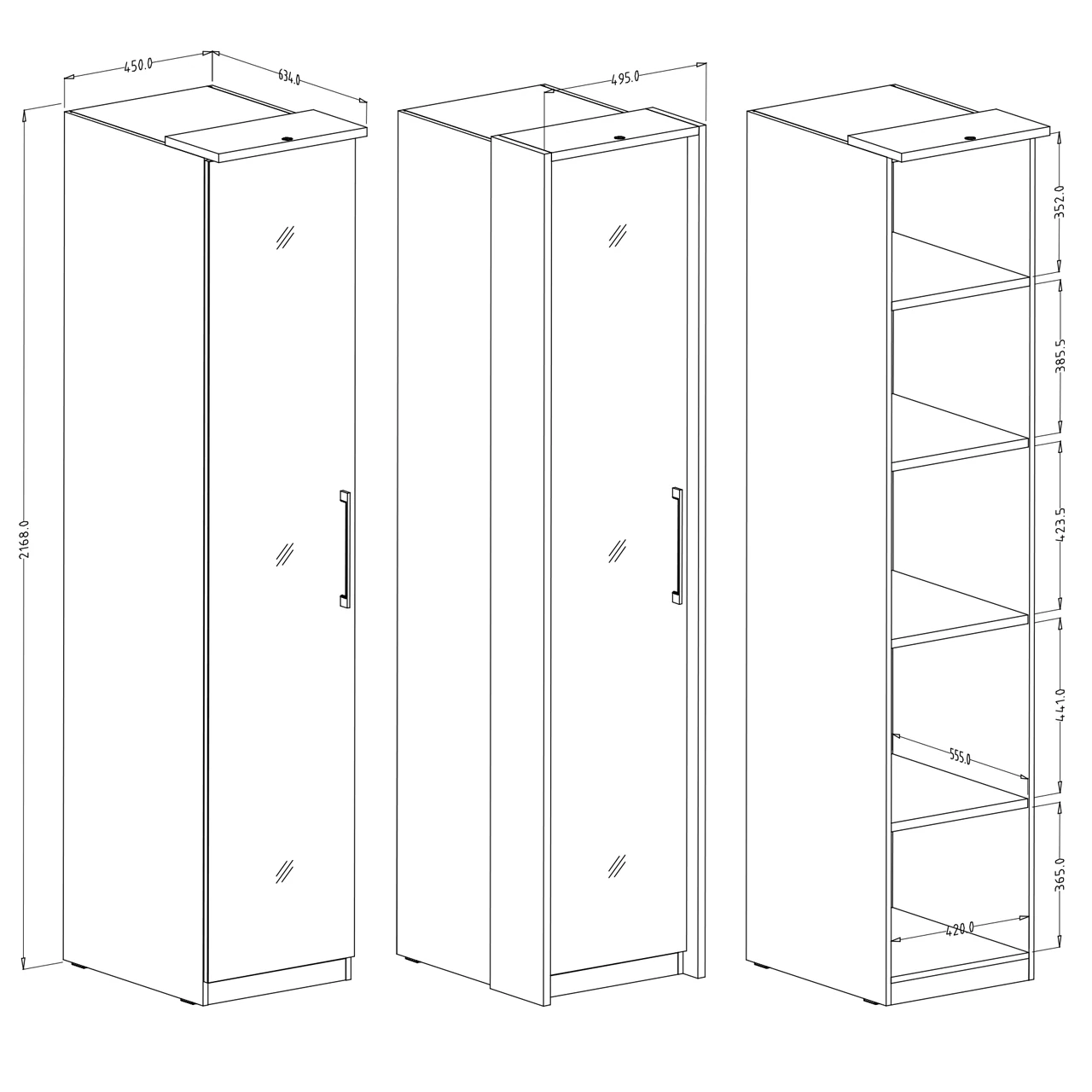 SIERRA eintüriger Kleiderschrank mit einem 45 cm breiten Spiegel, ausgestattet mit einer Flügeltür, hinter der sich Regale befinden.