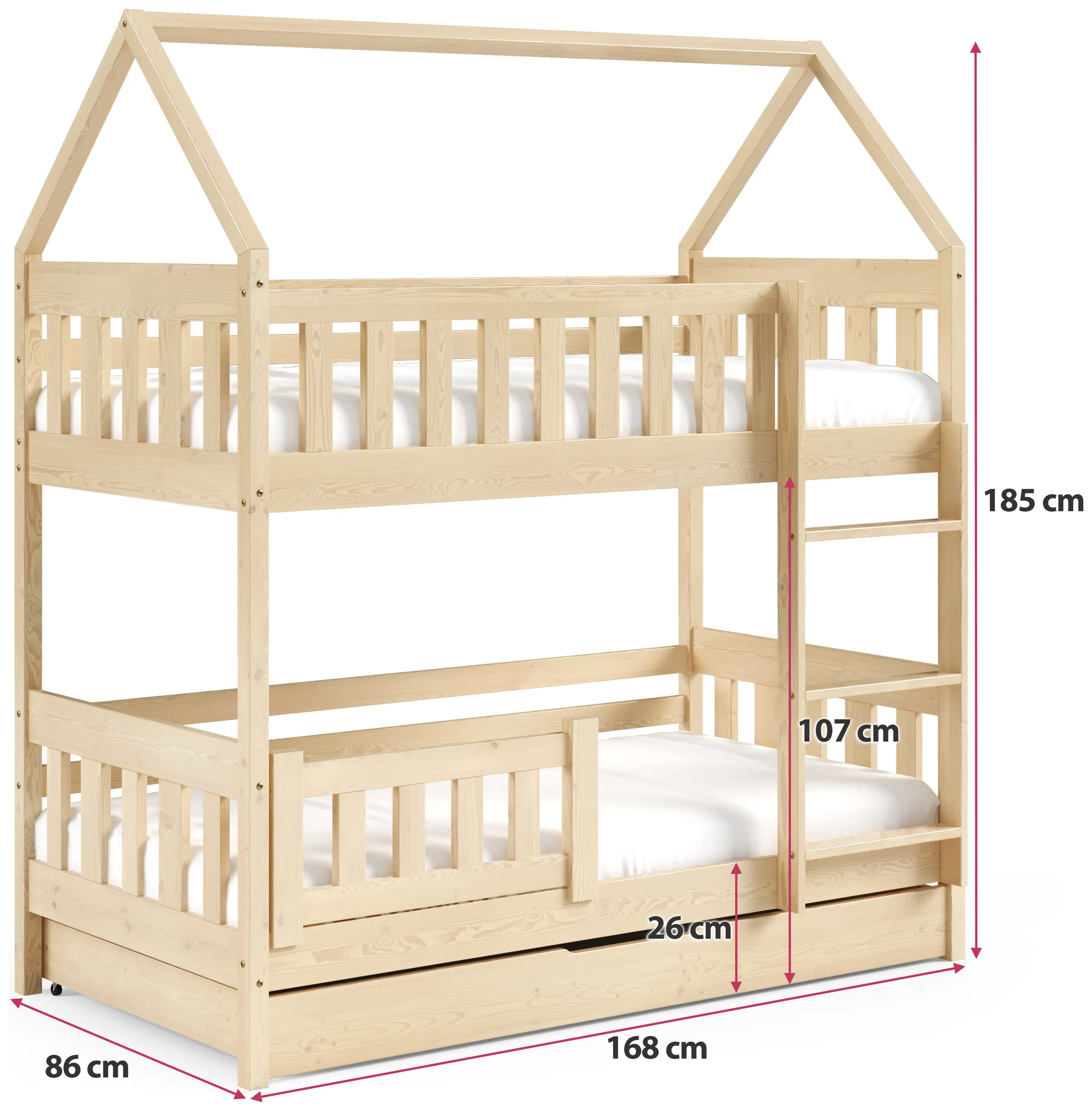 Das Schlüsselelement, das unser Etagenbett auszeichnet, ist die geräumige Schublade unter dem unteren Bett platziert. Diese Lösung ist nicht nur ästhetisch ansprechend, sondern vor allem praktisch - sie bietet zusätzlichen Stauraum für Bettzeug, Spielzeug oder Bücher und sorgt so für Ordnung im Kinderzimmer. Diese Schublade ermöglicht dank ihres Fassungsvermögens einen einfachen Zugriff auf das Wesentliche bei maximaler Raumausnutzung.