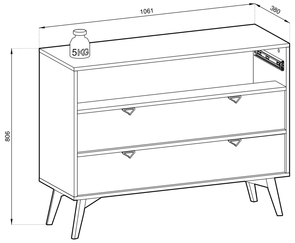 Hohe Holzbeine verleihen der Kommode nicht nur Leichtigkeit, sondern betonen auch ihren natürlichen Charakter. Darüber hinaus erleichtern die Beine die Sauberkeit unter den Möbeln.