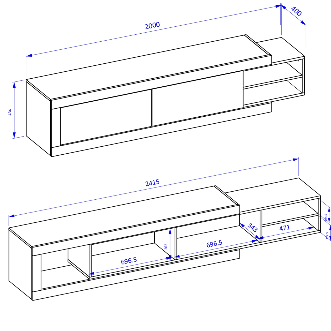 Moderner Fernsehschrank mit ausziehbarem Korpus, 200-241 cm breit, ausgestattet mit einer Flügeltür und offenen Regalen.