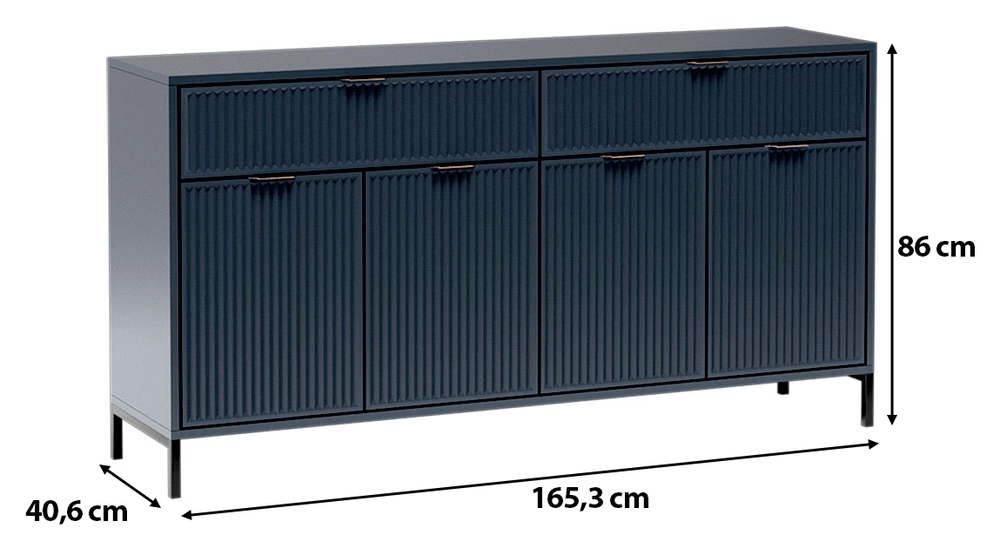 Geriffelte Fronten die Kommoden sind aus Massivholzplatten gefertigt MDF mit einer Dicke von 18 mm, die perfekt zur Indigofarbe des Schranks passt. Dieses besondere Detail verleiht der Kommode einen einzigartigen Charakter und ist gleichzeitig eine elegante Dekoration, die die Blicke auf sich zieht.