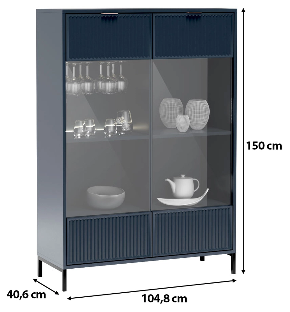 • Tauchen Sie Ihr Interieur in einen tiefen Indigo-Farbton mit unserer geräumigen LATINA Vitrine für das Wohnzimmer. Seine geriffelten Fronten verleihen ihm einen einzigartigen Charakter, der durch die schwarzen Metallbeine unterstrichen wird. Ideal zum Aus