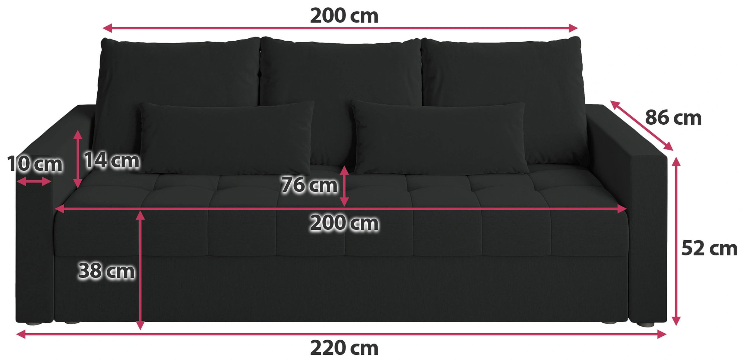 - Das Sofa verfügt über eine Schlaffunktion und hat eine Fläche von 135x200 cm . Die Liegeposition erreichen Sie, indem Sie den Sitz zu sich heranziehen und die Rückenlehne umklappen.