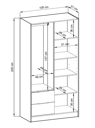 Grauer Kleiderschrank KELLY wurde in zwei Teile aufgeteilt. Auf der linken Seite befindet sich eine Kleiderstange, darunter ein Regal und zwei Schubladen, und auf der rechten Seite vier Regale aus laminierter Platte, so dass sich fünf praktische Aufbewahrungsnischen ergeben. Der Drehtürenschrank hat zwei Türen und ist 105 cm breit. Zwei geräumige Schubladen und höhenverstellbare Einlegeböden erleichtern das Ordnen Ihrer Kleidung. Ein verspiegelter Kleiderschrank vergrößert den Raum optisch und eignet sich daher perfekt für kleinere Räume.
