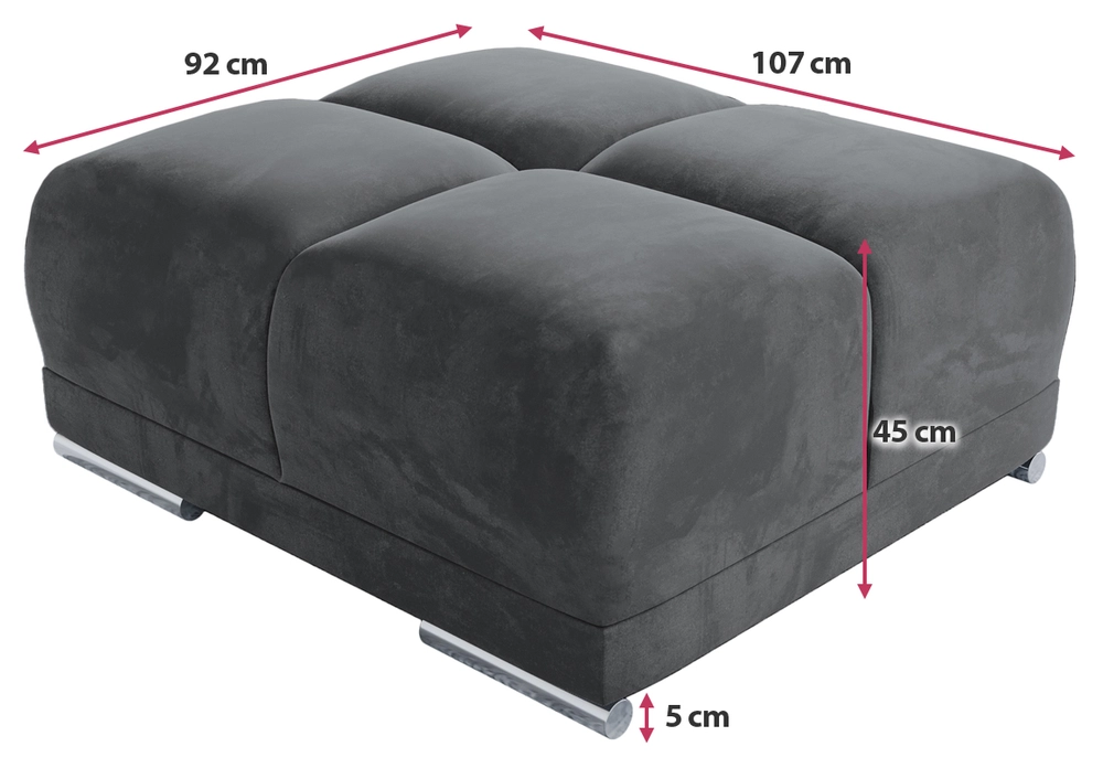 • Der Samt-Puff hat chromfarbene Beine aus Metall .