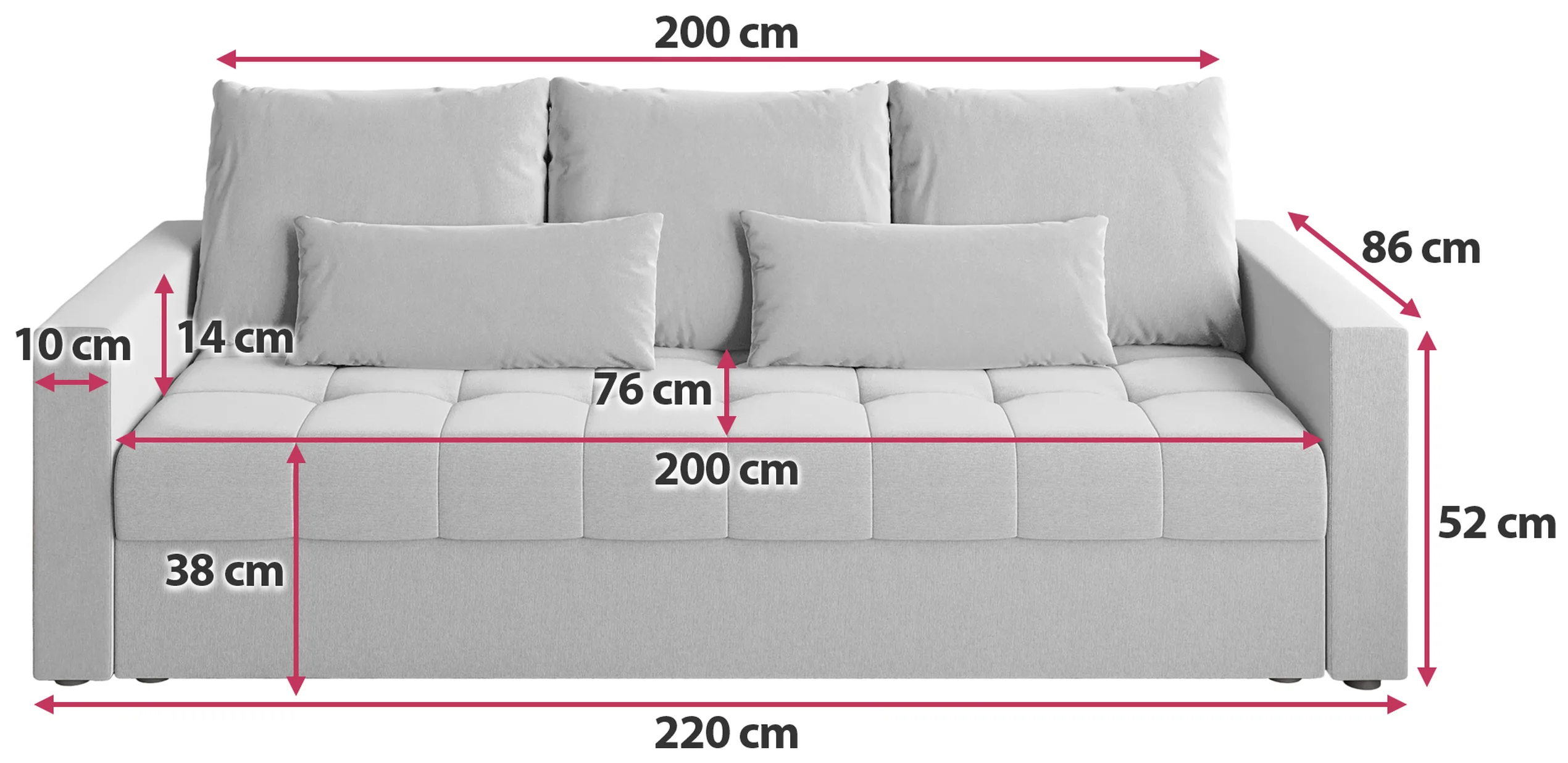 - Das Sofa verfügt über eine Schlaffunktion und hat eine Fläche von 135x200 cm . Die Liegeposition erreichen Sie, indem Sie den Sitz zu sich heranziehen und die Rückenlehne umklappen.