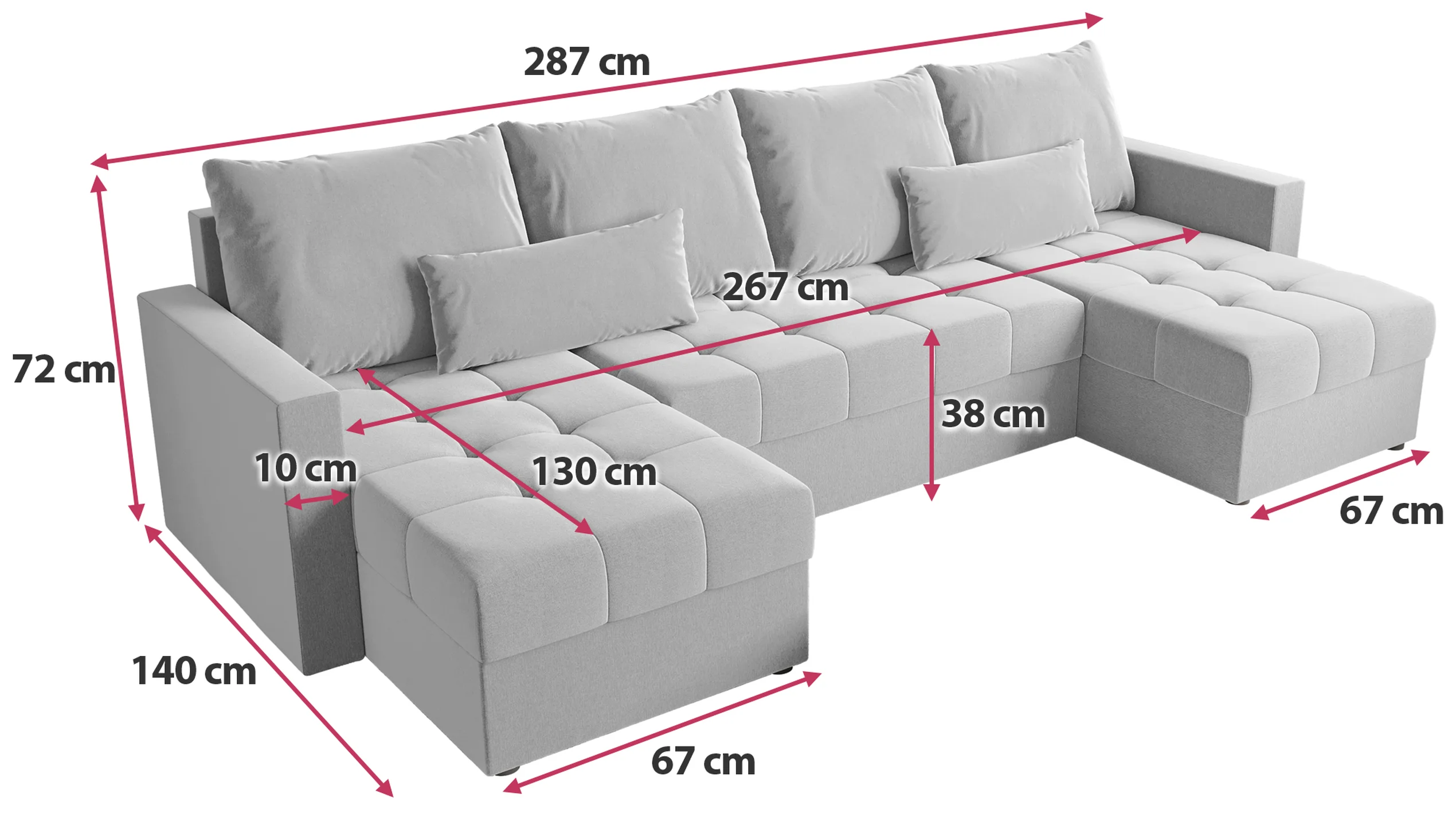Verleihen Sie Ihrem Wohnzimmer mit dem modernen U-förmigen Ecksofa HOT eine neue Dimension der Funktionalität . Es passt perfekt in größere Wohnzimmer und bietet einen komfortablen Ort zum Entspannen für die ganze Familie. Dank der Schlaffunktion mit den Maßen 120x267 cm lässt sich dieses Ecksofa ganz einfach in ein bequemes Bett verwandeln, ideal für den Alltag oder als zusätzliche Schlafgelegenheit für Gäste.