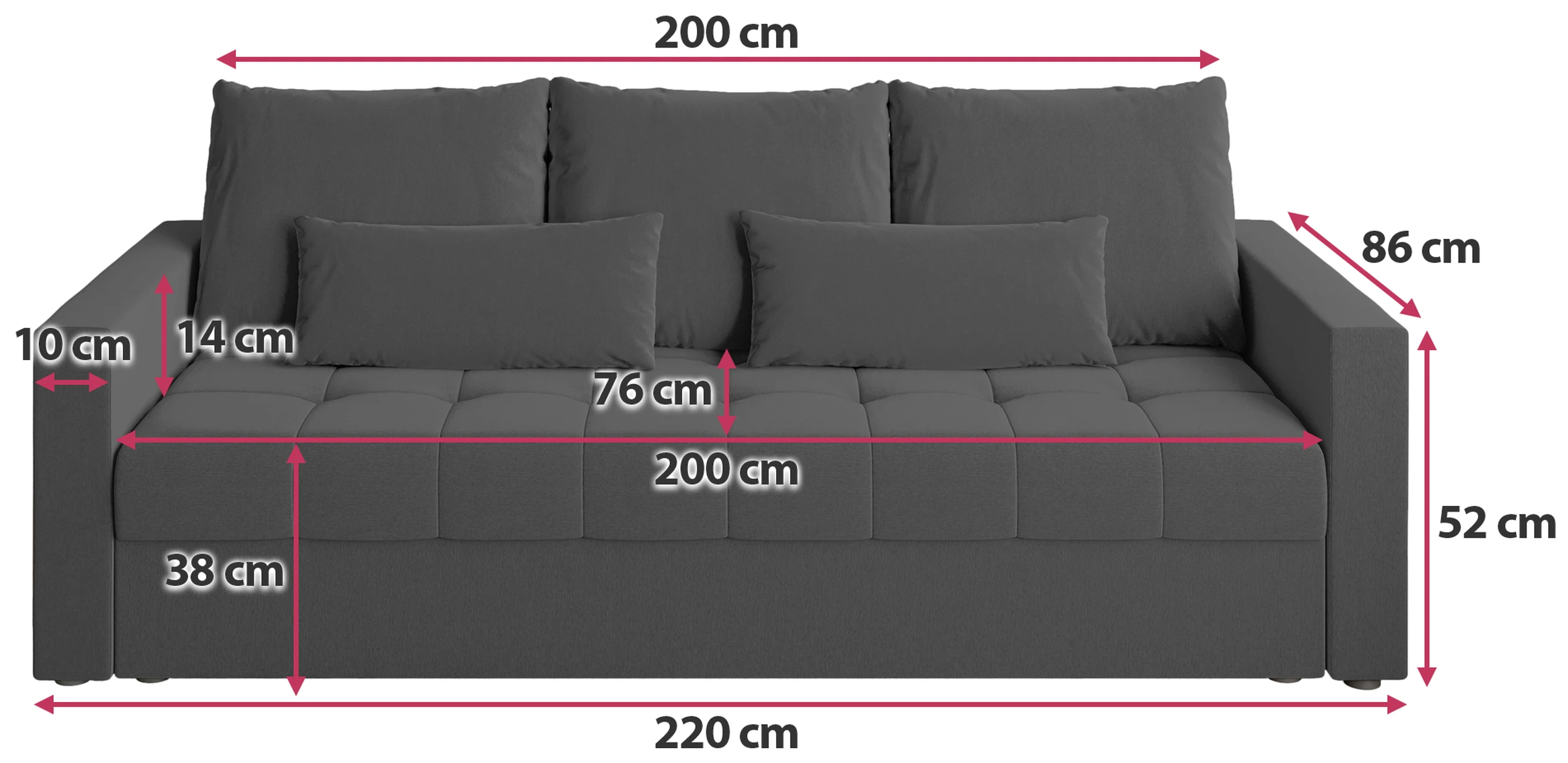 • Das Sofa verfügt über  eine Schlaffunktion und hat eine Fläche von 135x200 cm . Die Liegeposition erreichen Sie, indem Sie den Sitz zu sich heranziehen und die Rückenlehne umklappen.