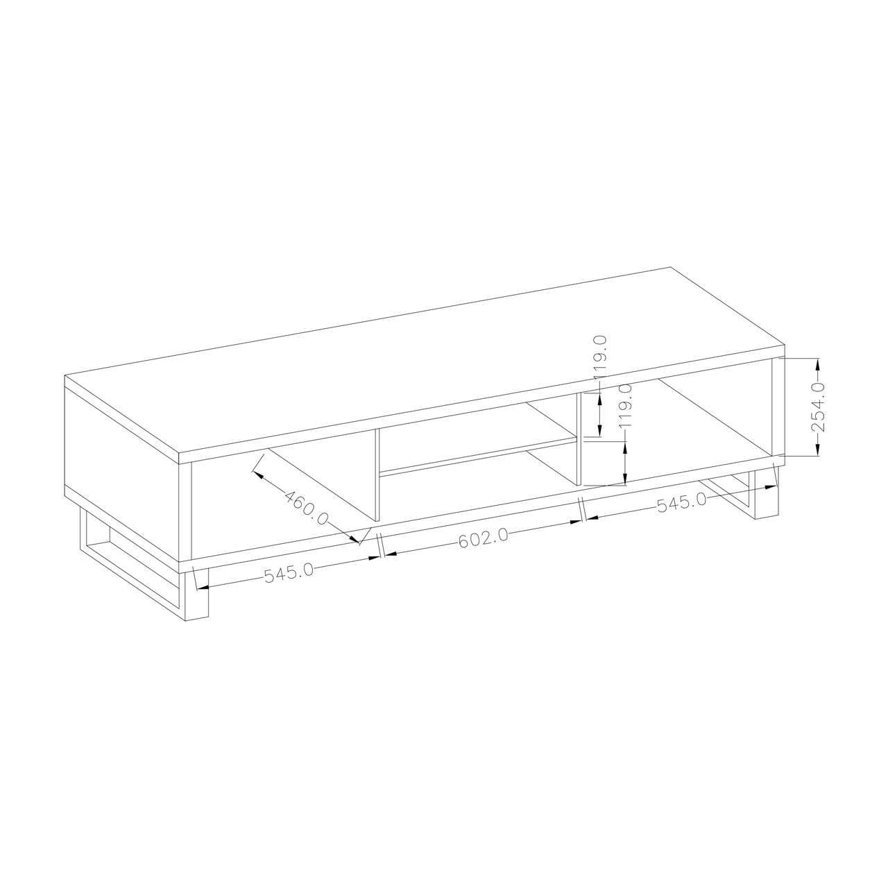 Loft-RTV-Schrank mit nach unten gerichteten Türen und Einlegeböden.