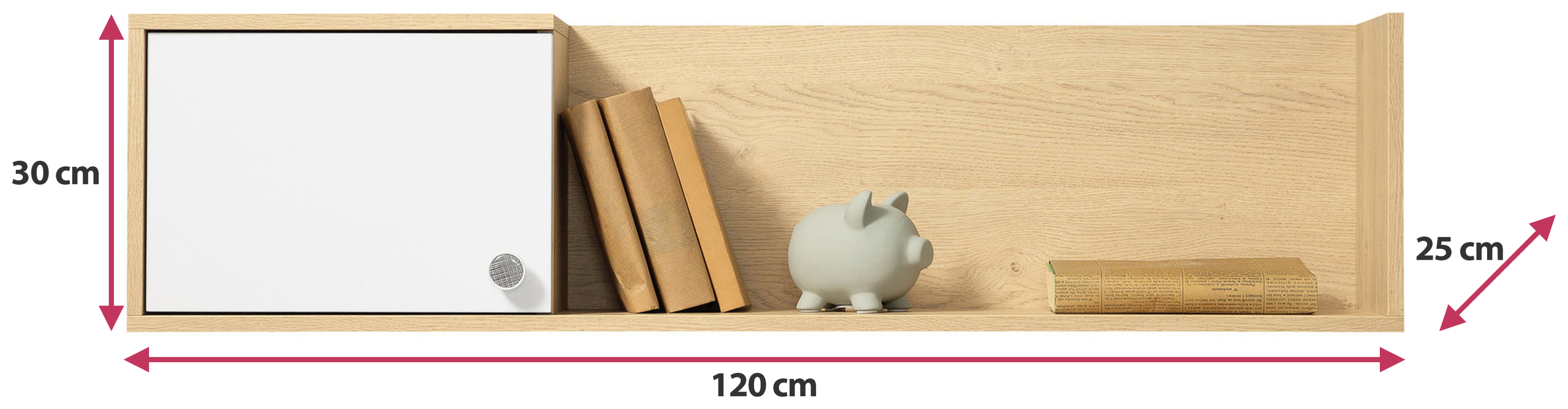 Den großen Freiraum, den dieses moderne Regal bietet, verdankt es seinen Maßen: Breite 120 cm , Höhe 30 cm , Tiefe 25 cm .