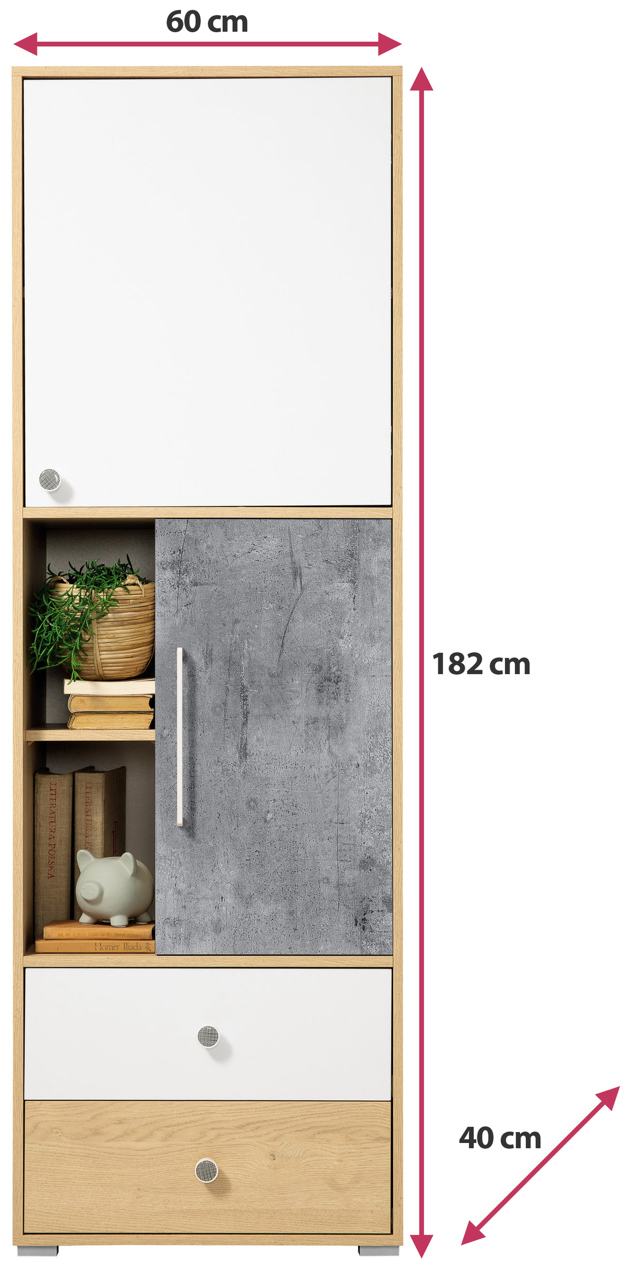Die Farbgebung dieses Regals ist eine perfekt abgestimmte und elegante Kombination aus drei Farbtönen: Eichenschwamm, Luxweiß und Beton . Diese Farbkombination wird uns jeden Morgen zum Handeln motivieren und eine warme und gemütliche Atmosphäre schaffen, die alle aufheitern wird. Weiße Kunststoffgriffe verleihen Eleganz.