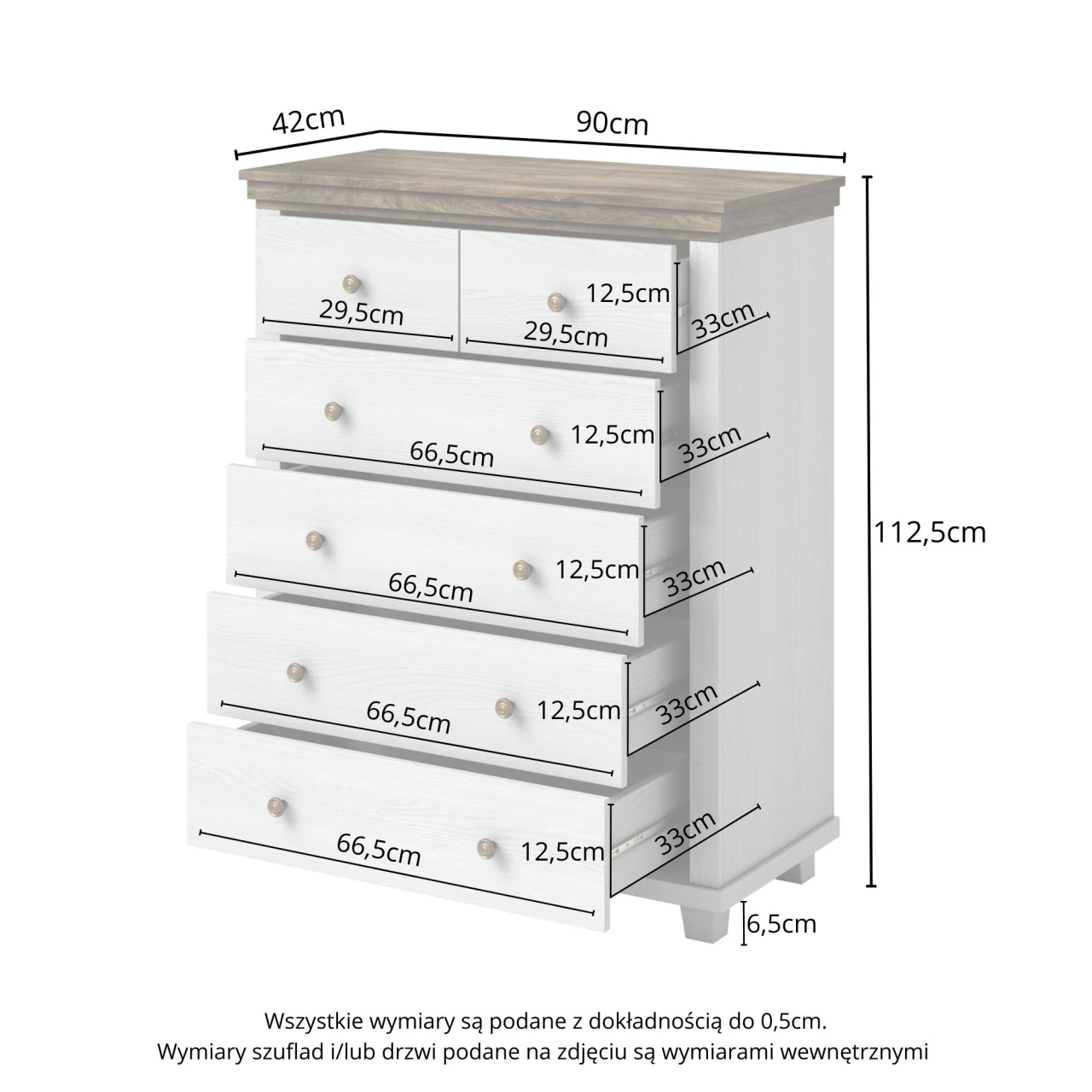 Geräumige 90 cm breite Kommode mit vier Schubladen und zwei kleineren Schubladen.