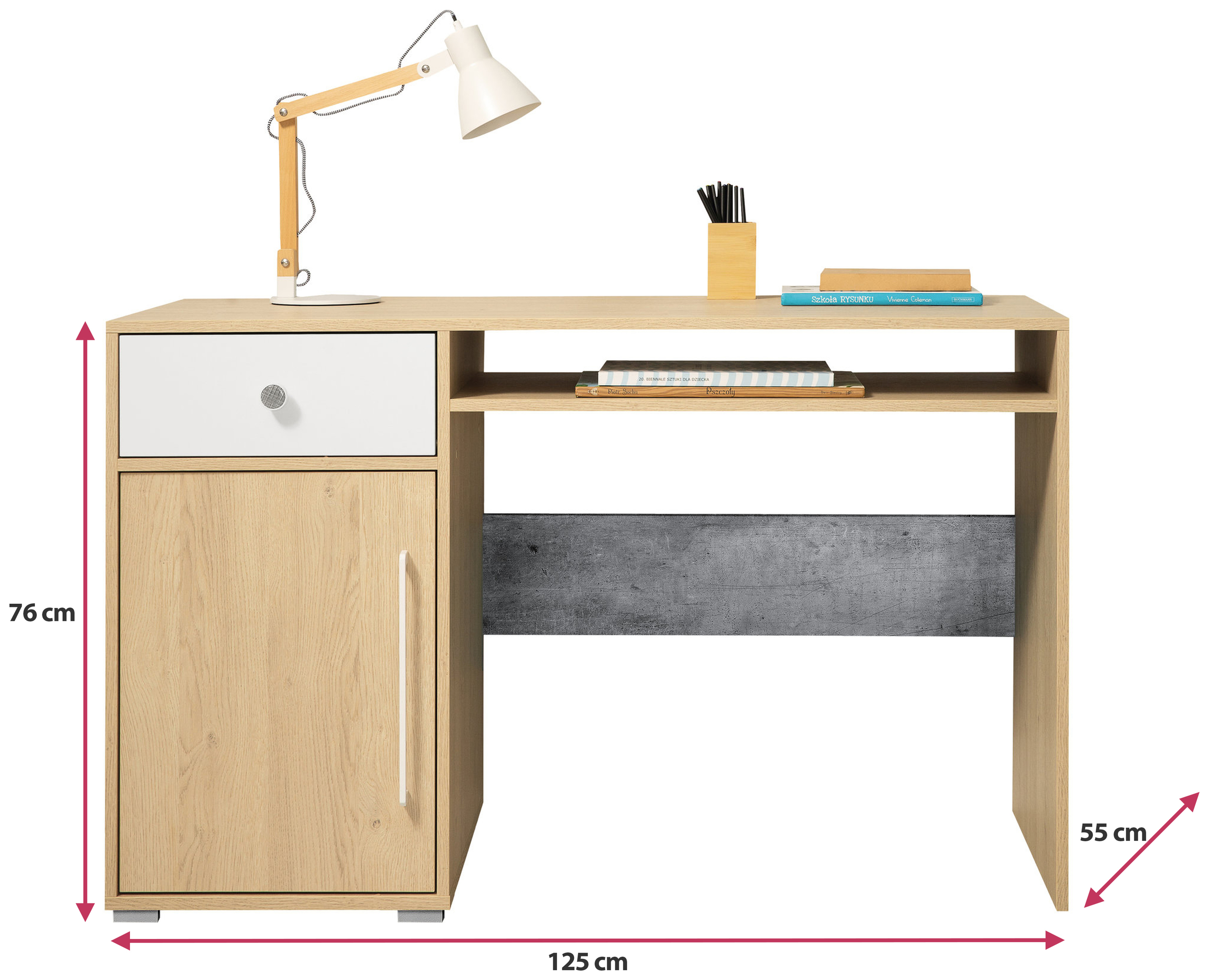 Da sich dieser Schreibtisch insbesondere an junge Leute richtet, wurde auch hier auf eine moderne Farbgestaltung gesetzt, die die drei Farbtöne Schwammeiche , Luxweiß und Beton kombiniert . Durch diese Farbauswahl können wir dieses Möbelstück problemlos in jedem Jugendzimmer platzieren.