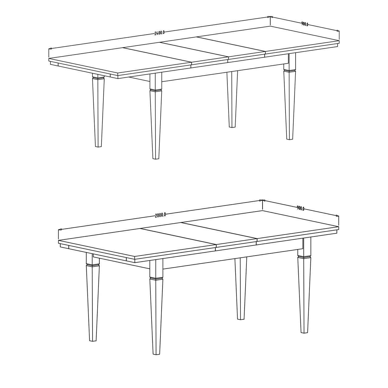 Esstisch im klassischen Stil mit einer Platte von 240x90 cm im ausgeklappten Zustand.
