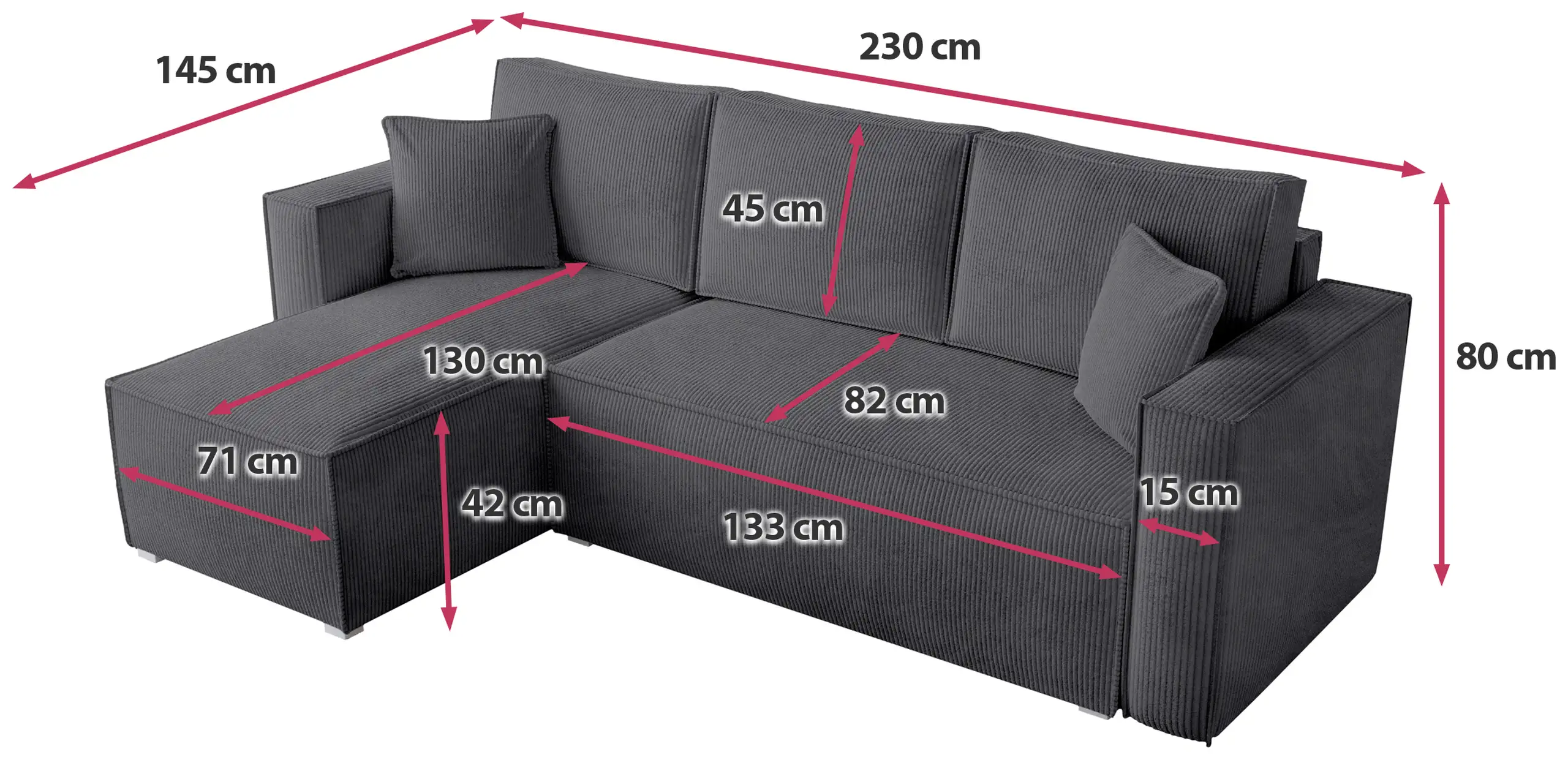 • Das moderne TOP Ecksofa für das Wohnzimmer wird Ihr Wohnzimmer sicherlich verwandeln. Das ausziehbare Ecksofa ist mit Cordstoff gepolstert. Das Ecksofa für das Wohnzimmer verfügt über eine Schlaffunktion, einen Bettcontainer und ein Kissenset. Die Beine d