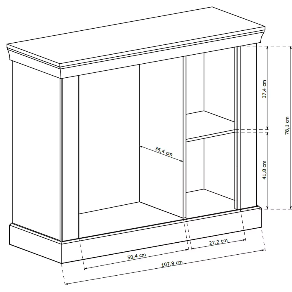 Kommode ADRE hat ein elegantes Design, das sich ideal für klassische Raumsituationen eignet. Die Kommode ist mit vier geräumigen Schubladen und einem Schrank auf der rechten Seite ausgestattet, der ein Regal enthält.
