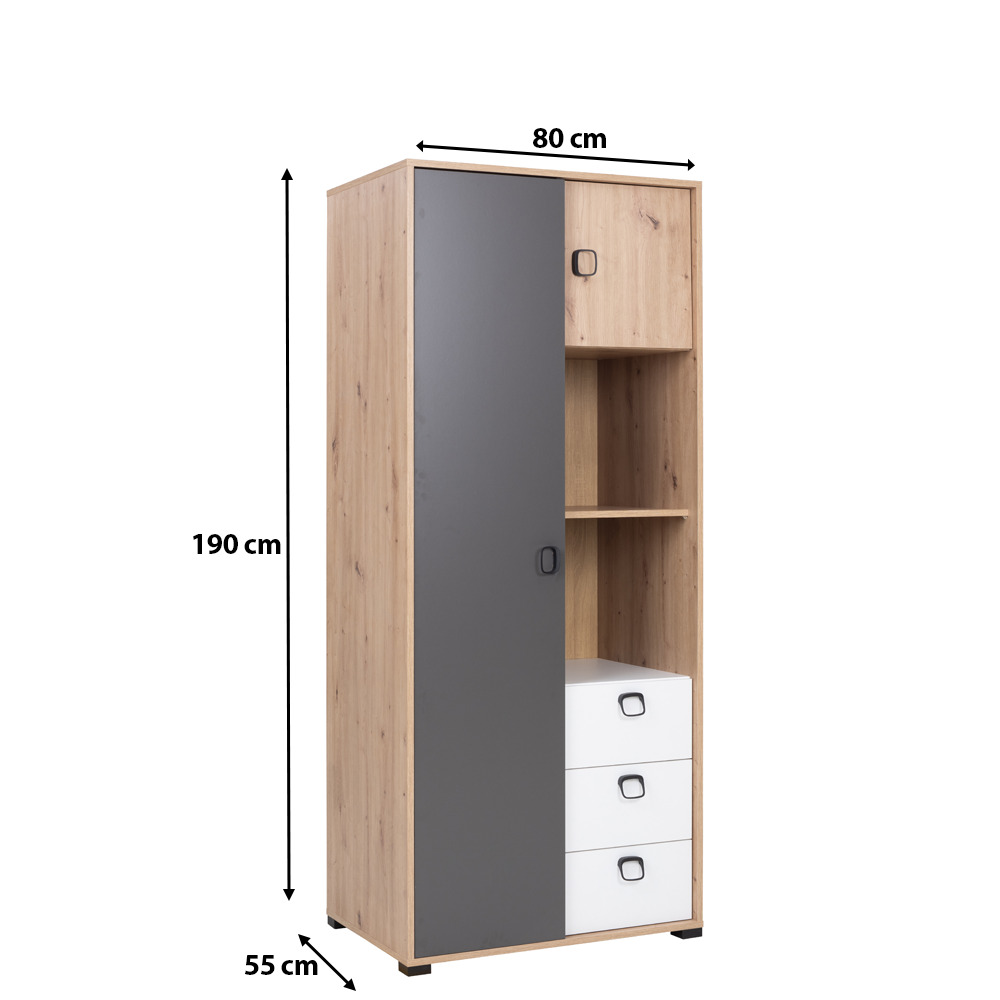 Junior Garderobe CAMERUN besticht durch sein modernes Design und seine praktische Raumlösung. Der 80 cm breite Jugendzimmerschrank wurde mit Blick auf die Bedürfnisse der Jugend von heute entworfen und vereint Funktionalität, Ästhetik und Komfort. Der linke Teil des Schranks verbirgt hinter der Tür eine praktische kleiderstange, zur Aufbewahrung von Kleidung, die aufgehängt werden muss, wie Hemden, Kleider und Anzüge. So hat Ihr Kind leichten Zugang zu seinen Lieblingskreationen. Drei geräumige Schubladen auf kugelgelagerten Schienen, unter der Tür ist der perfekte Ort, um kleine Accessoires, Unterwäsche oder sogar Schuhe zu verstauen. Kugelgelagerte Schienen sorgen für sanftes und leises Öffnen und Schließen der Schubladen, die jeder junge Nutzer zu schätzen weiß. Der Jugendkleiderschrank mit Regalen hat ebenfalls zwei offene Ebenen, ideal für die Aufbewahrung von Büchern oder Schulsachen. Sie machen den Raum übersichtlicher und sorgen für mehr Ordnung im Zimmer. Kanten durch ABS-Furnier geschützt die Verwendung der Gehäusekonstruktion gewährleistet ihre Langlebigkeit und Widerstandsfähigkeit gegen mechanische Beschädigungen. Das moderne Design und die Liebe zum Detail sorgen dafür, dass sich die moderne Jugendzimmergarderobe perfekt in jede Einrichtung einfügt und ihr Frische und Energie verleiht. Holen Sie sich diese einzigartige Jugendgarderobe nach Hause, die selbst die Erwartungen der anspruchsvollsten Jugendlichen erfüllt und Stil und Funktionalität für viele Jahre garantiert.